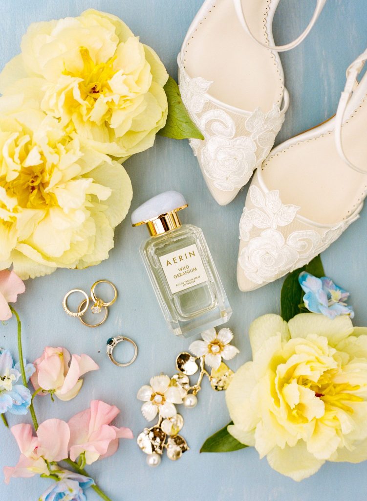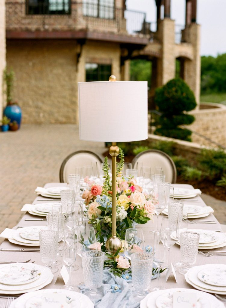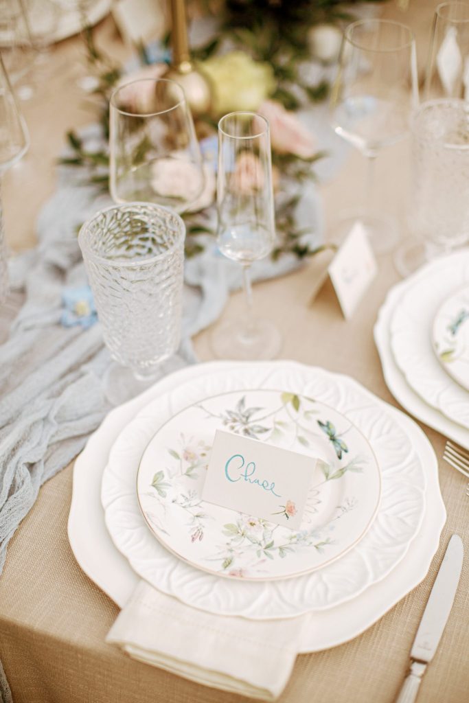 We are the biggest fans of Maddy and Chase, and we are way too excited to share all the stunning details of their day! Ever Something truly outdid themselves with all the beautiful florals in pastel shades of blue, pink and yellow, with lush greenery accents throughout. Perfectly arranged place settings from Party Pro Rents made for a picturesque setting on their one big, communal-style table, where guests enjoyed a homemade dinner from the mother of the bride. Their delicate wedding cake from Allie’s Baking Boutique and scrumptious cookies from Baked Cookie Co. ended the night on a perfectly sweet note. You can’t help but smile looking through their wedding gallery, as their love for one another is so infectious and radiant! Scroll to see all the whimsical and gardenesque details of their corona wedding day and to fall in love like we did. Cheers to Maddy and Chase!
