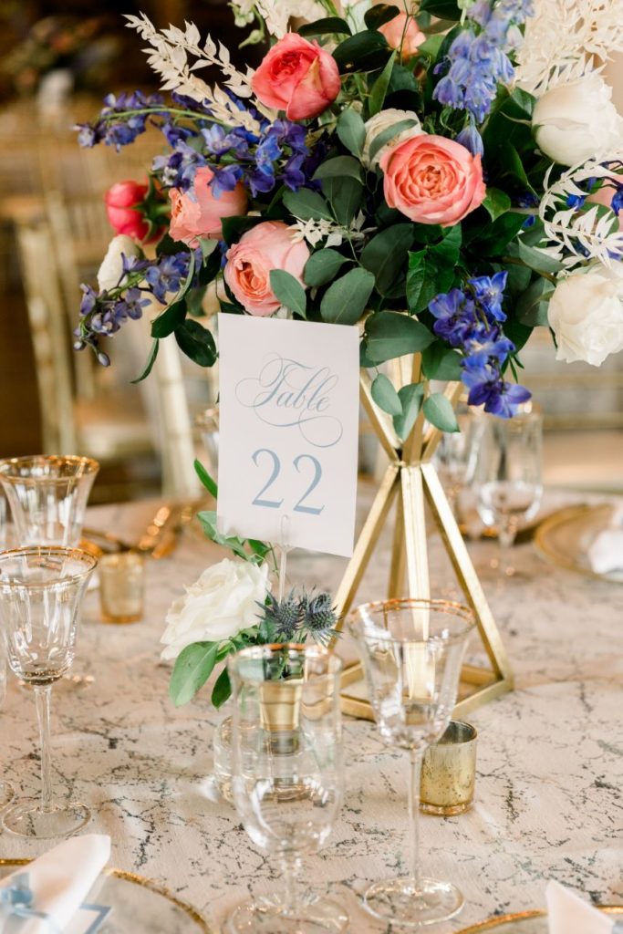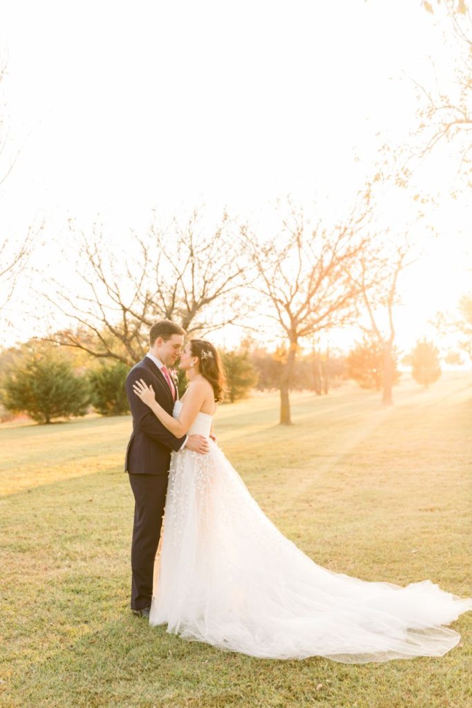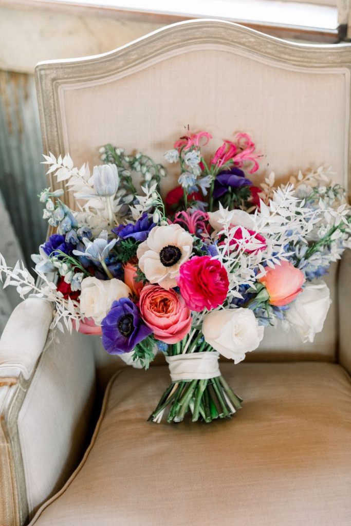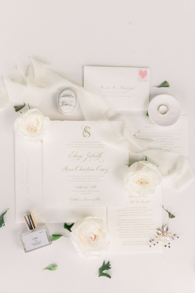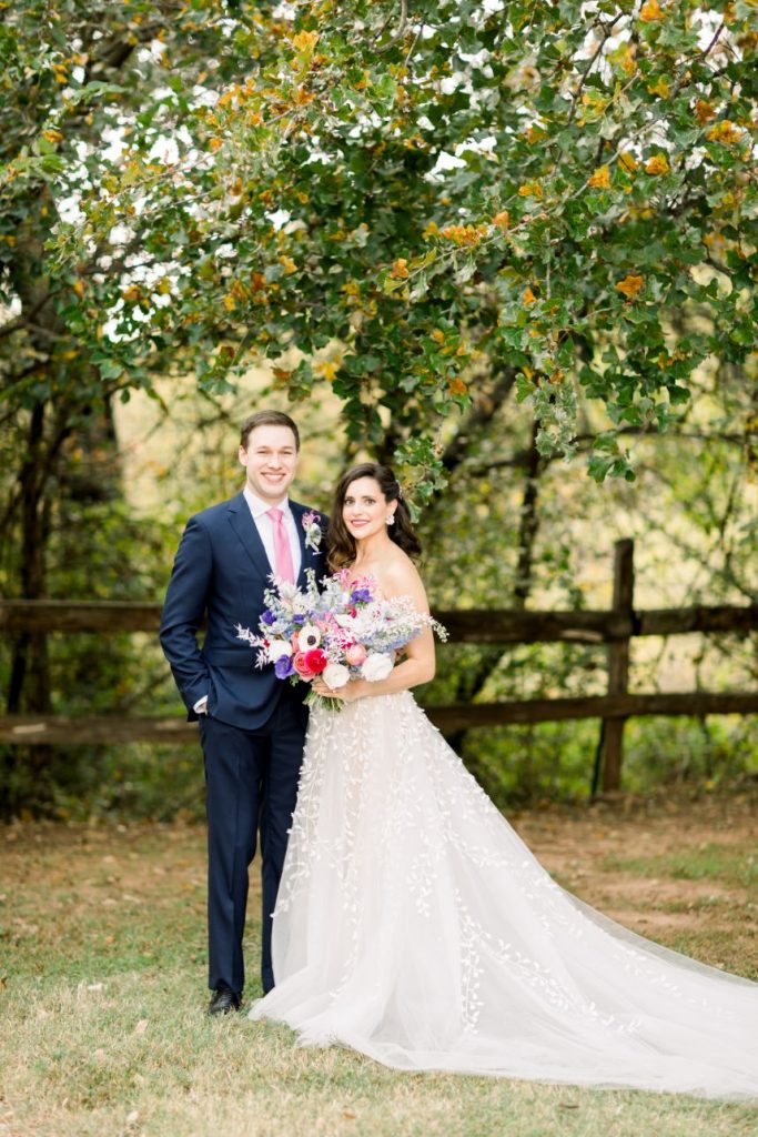 Grandmillennial style gets a touch of modern flair in this whimsical wedding absolutely full of garden romance! We’re pretty sure Elaine and Sean are the coolest couple we’ve ever seen, as they met while both working together in Washington D.C. for the Senate, had their first date consist of a tour of the West Wing, and they even have an article written about them in the New York Times. Southwind Hills was the perfect venue for their whimsical garden party – providing everything from the bridesmaids’ luncheon to the catering to the florals – as it’s rustic setting with beautiful autumnal-colored leaves and wooden accents complement this punchy color palette of blues, purples and bright fuchsia too well. A clean and elegant white invitation suite from Paper + More with gold lettering made for flawless detail shots, as well as the addition of the couple’s stunning rings from Naifeh Fine Jewelry that added a little bit of eye-catching sparkle. A reception space full of hanging greenery and faux-marble linens from Party Pro Rents is the embodiment of grandmillennial style, bringing the garden party feel indoors with bunches of bright blooms and tons of natural light, accented by clear and gold decor throughout. After a cocktail hour with the most breathtaking views of the Oklahoma sunset, guests enjoyed an incredible meal from Southwind Hills while Royal Duke’s Band played soothing jazz tunes through the whole dinner. Amy Cakes created a delectable masterpiece of an all-white five tier wedding cake, complete with small white fondant flowers for the perfectly delicate cake of our dreams. After their reception, the celebration continued as the couple and a few guests made their way downtown to the 21c Museum Hotel where they partied into the late hours of the evening and then retreated to their luxury rooms for a nights rest. With the bride graduating from OSU and the groom from OU, there seems to be one thing they can both agree on, beating Texas, which is why the day after their wedding the celebration continued with a bowling party and watch party where they watched OU beat Texas in the Red River Rivalry – truly the perfect ending to their wedding weekend! Looking through all of the incredible photos of this day from Mary Keen Photography is like the gift that keeps on giving – not to mention that this couple’s gift registry was from the always-amazing Bebe’s, who had all of the wedding presents this couple could have dreamt of. Scroll to see all of the details of this whimsical garden wedding that brings a modern flair to grandmillennial style and to read about the bride’s favorite vendor. Cheers to Mr. and Mrs. Casey!