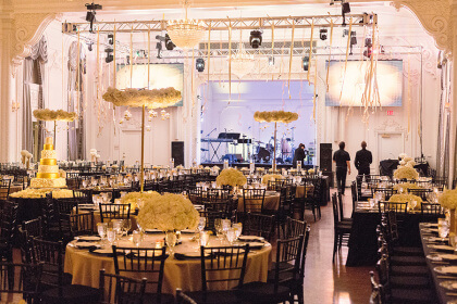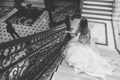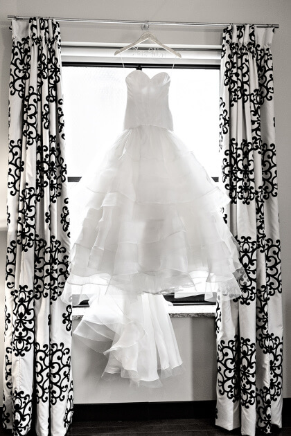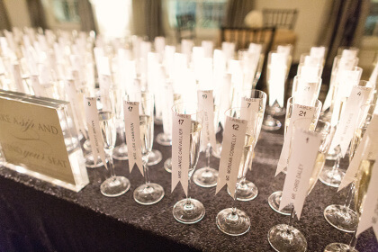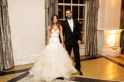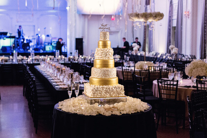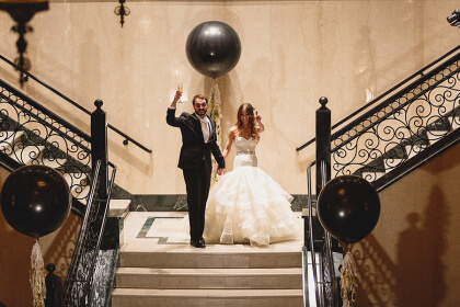 The cocktail hour took place in the stunning Grand Hall of The Mayo where the bride and groom made their entrance on the grand staircase. Dinner followed in the awe-inspiring historic Crystal Ballroom. Guests were greeted with champagne escort cards and were instructed to “Take a Sip and Find Your Seat.” The ballroom was decorated with lush white flowers, floating candles, sequin linens and gold ribbon hanging over the dance floor. In the middle of the room stood a seven-tiered show-stopping cake, which came with a sparkler surprise during the cake cutting. After the delicious dinner, the band, Lost Wax, kicked off an epic dance party.