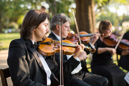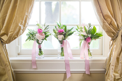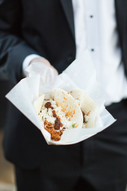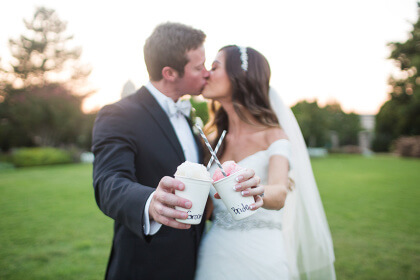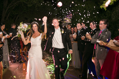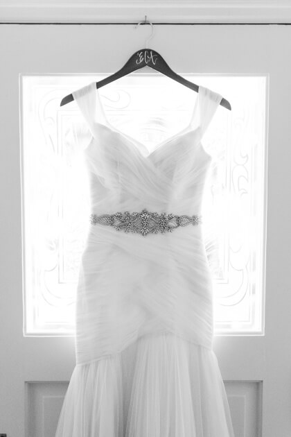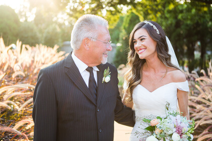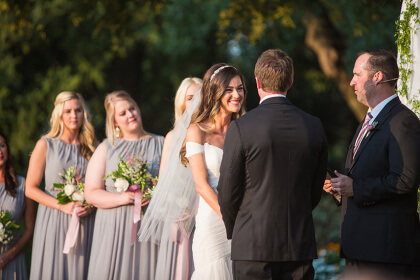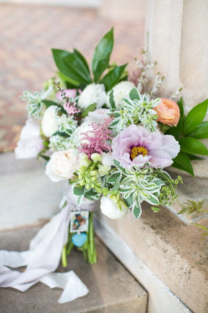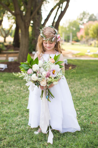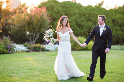 The Oklahoma Governor’s Mansion was the best location to accommodate all of their wishes of a beautiful garden wedding due to its gorgeous views. Elizabeth walked down the aisle in an Essence of Australia dress with a sweetheart neckline and straps elegantly draped over her shoulders. A belt with diamond detail to accentuate her waist was added to the toile-wrapped trumpet style gown. A simple headband added sparkle to her long hair to complete the look of romance and elegance. Elizabeth hand-made a New England Patriots-themed garter, which is Adam’s favorite football team. Before the wedding, Elizabeth and Adam silently read letters they had written to each other while holding hands on opposite sides of a large door in lieu of a first look.