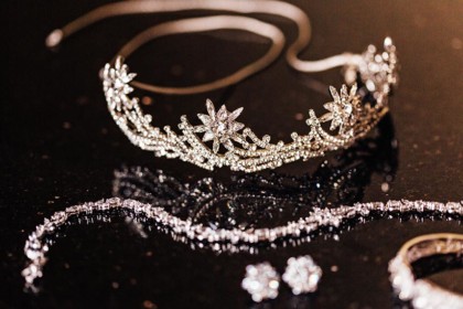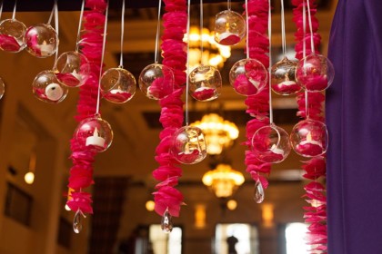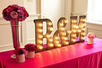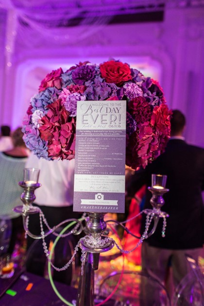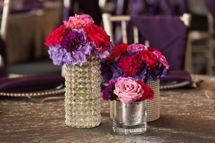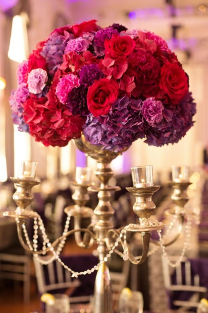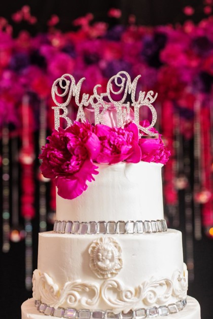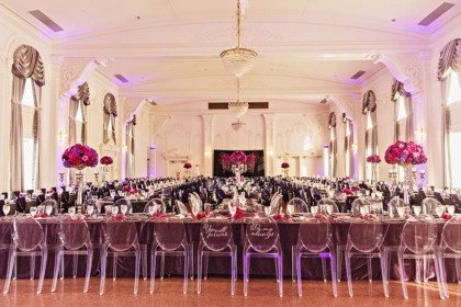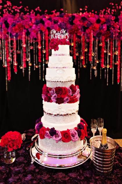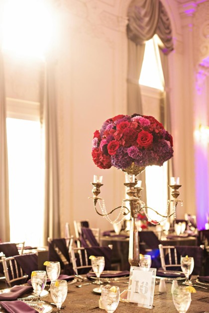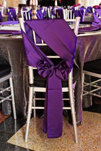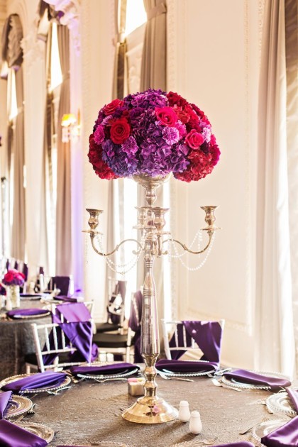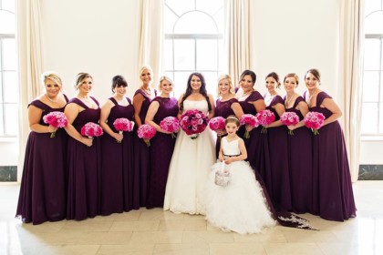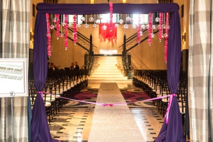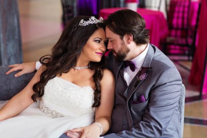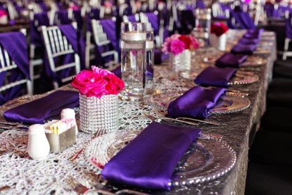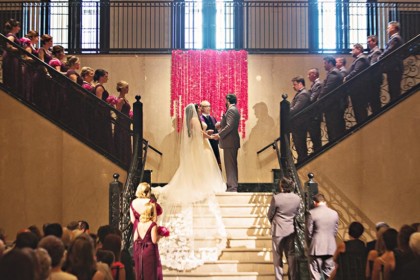 Surrounded by hues of purple, silver and fuchsia, the bride, Rachel, wore a custom gown by designer Anne Barge as her father escorted her down a glitter-lined aisle. Her one-of-a-kind veil was topped off by a crystal tiara and cascaded beyond her dress and down the grand stairway of Tulsa’s Mayo Hotel, where she and her groom, Mark, exchanged their vows.