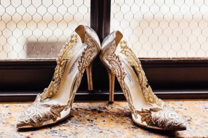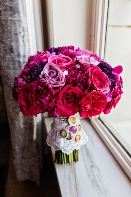 Her flower bouquet was wrapped with lace cuffs worn by her mother at her parents’ wedding 37 years prior and hanging from the stems were charms with photos of the bride’s grandparents.