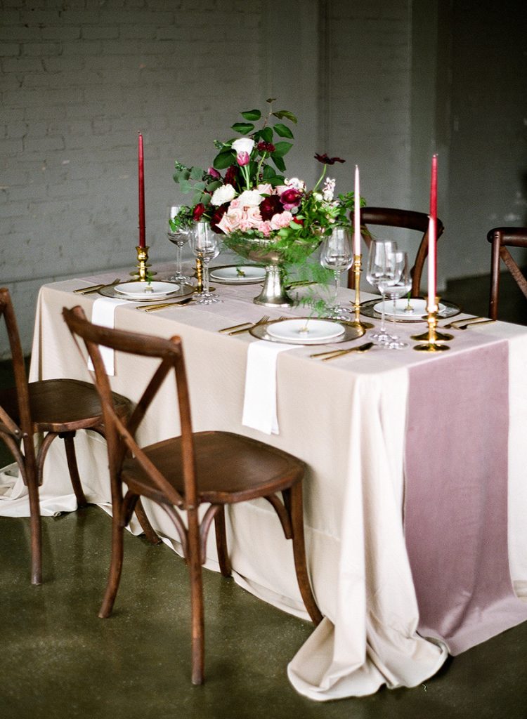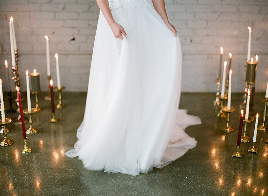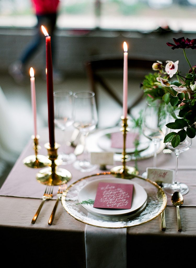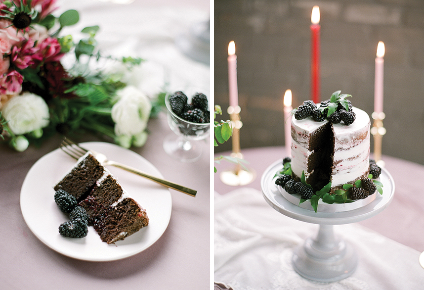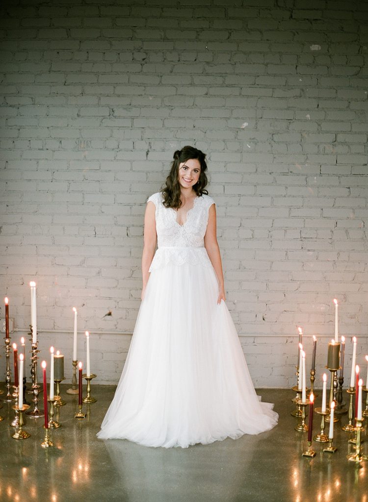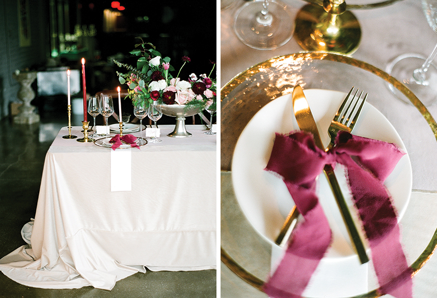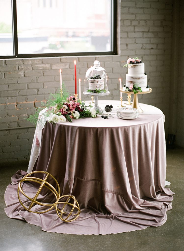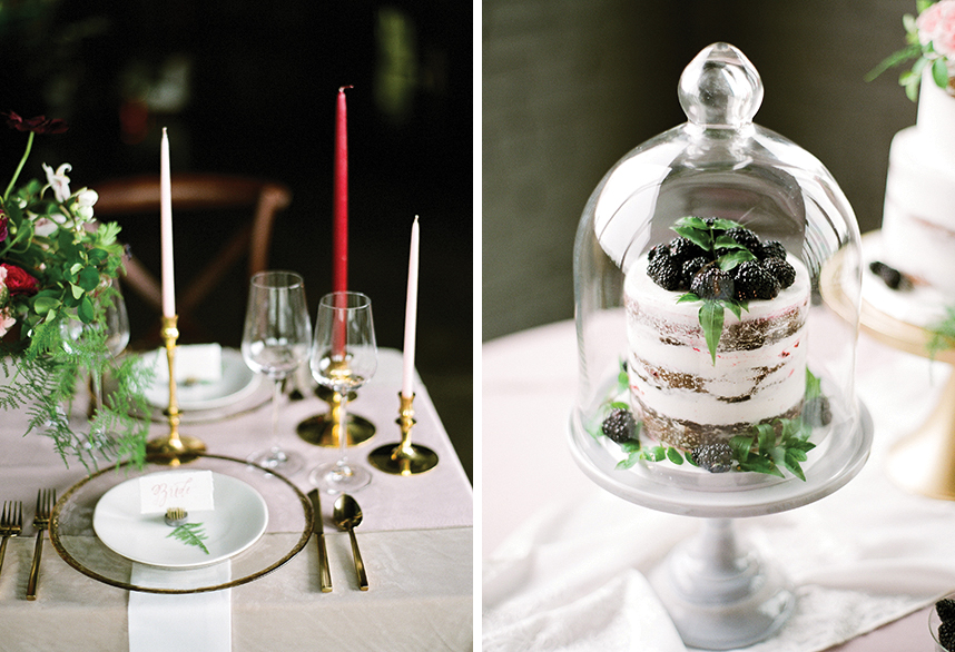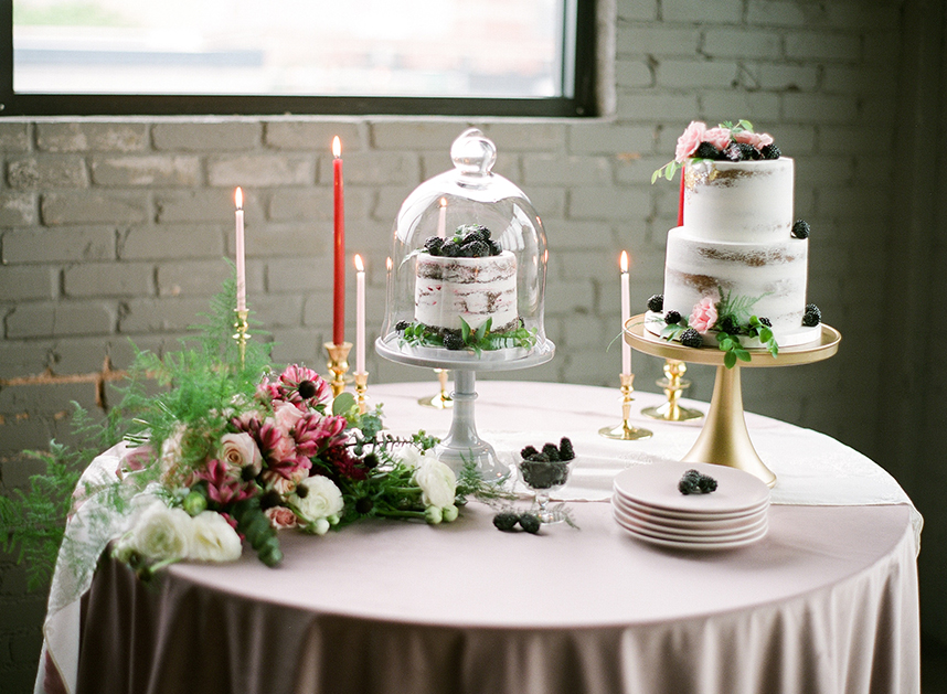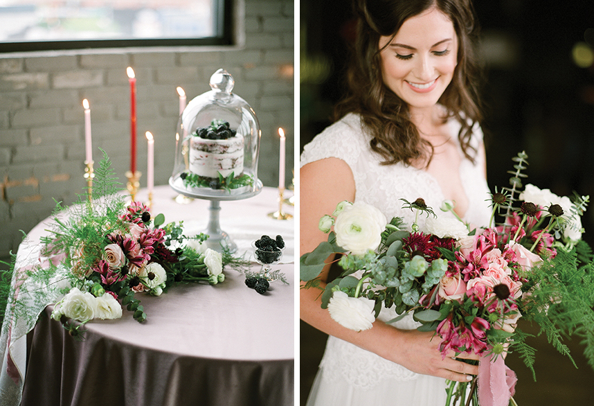 Conceptualized with a rich color scheme in shades of merlot and mauve, the team at June Sixteenth Events & Florals is giving us endless amounts of moody, old-world wedding inspiration. Beginning with the handwritten calligraphy invitation suite from Prairie Letter Shop, ribbons and vintage stamps add a unique touch of old-meets-new to the feel of this styled shoot. The industrial backdrop of Waters Edge Winery added just the right touch of rustic charm for the romantic table set with gold-rimmed china and flatware, velvet linens and crossback chairs from Marianne’s Rentals. A separate table housed delicious treats, including the simple yet decadent two-tier blackberry and rose embellished cake by Amy Cakes. But one of the most stunning elements of this shoot is, of course, the beautiful model bride in a floor-sweeping lace and tulle gown from Chantilly Couture and soft, natural makeup with a curled partial updo from Brushed Salon. We can’t get enough of this moody, berry-hued styled shoot!