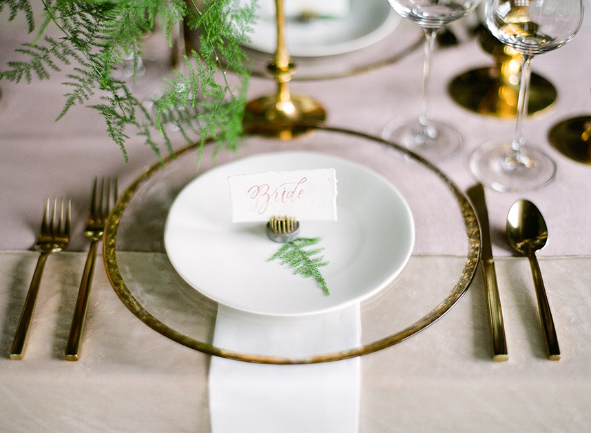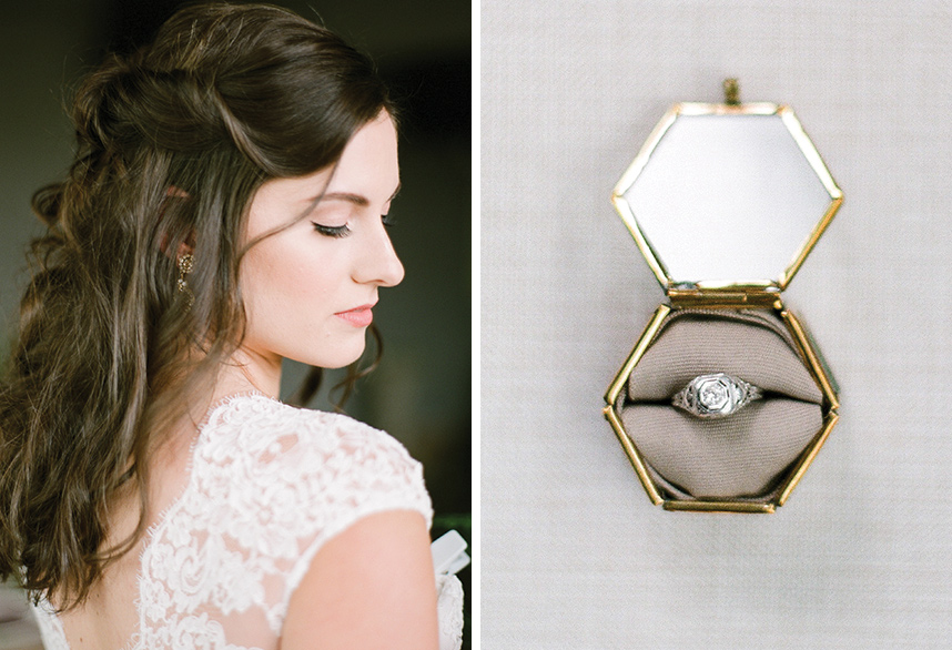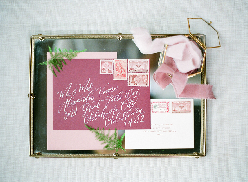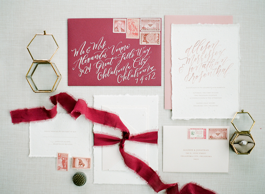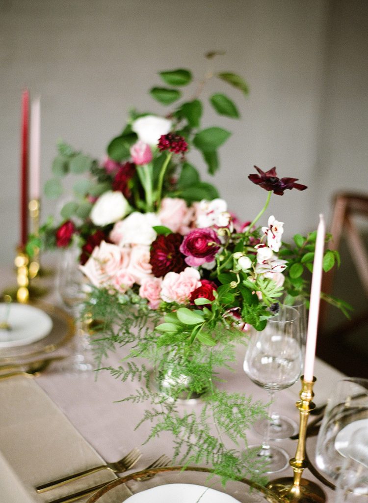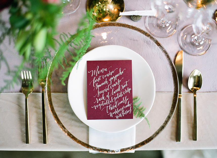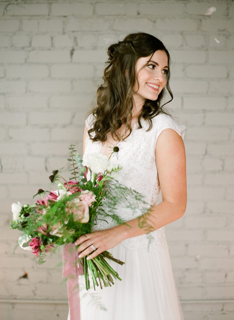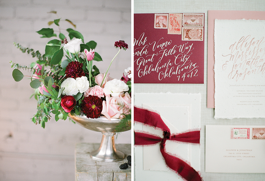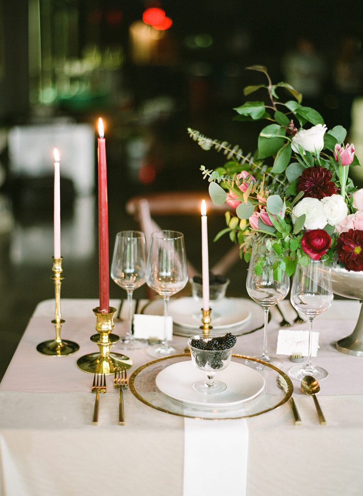 Conceptualized with a rich color scheme in shades of merlot and mauve, the team at June Sixteenth Events & Florals is giving us endless amounts of moody, old-world wedding inspiration. Beginning with the handwritten calligraphy invitation suite from Prairie Letter Shop, ribbons and vintage stamps add a unique touch of old-meets-new to the feel of this styled shoot. The industrial backdrop of Waters Edge Winery added just the right touch of rustic charm for the romantic table set with gold-rimmed china and flatware, velvet linens and crossback chairs from Marianne’s Rentals. A separate table housed delicious treats, including the simple yet decadent two-tier blackberry and rose embellished cake by Amy Cakes. But one of the most stunning elements of this shoot is, of course, the beautiful model bride in a floor-sweeping lace and tulle gown from Chantilly Couture and soft, natural makeup with a curled partial updo from Brushed Salon. We can’t get enough of this moody, berry-hued styled shoot!