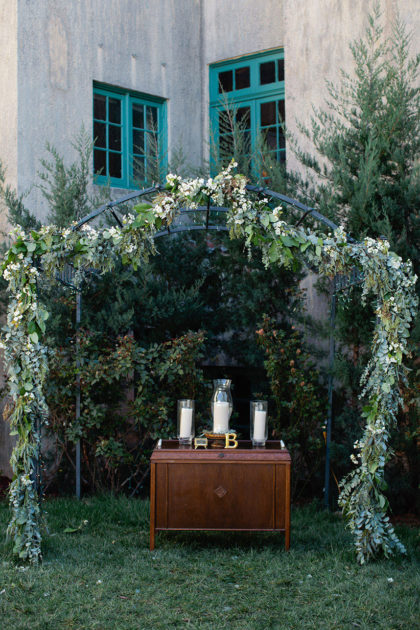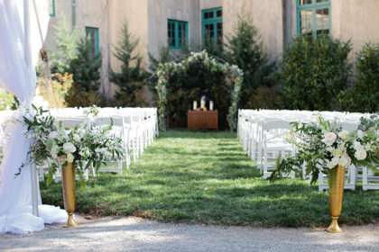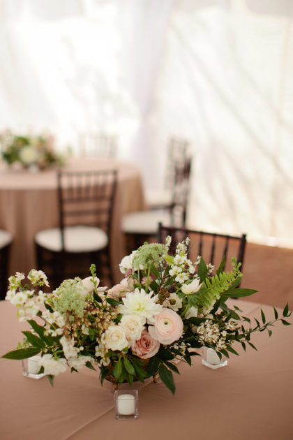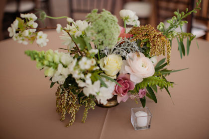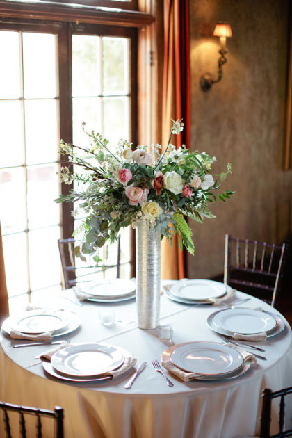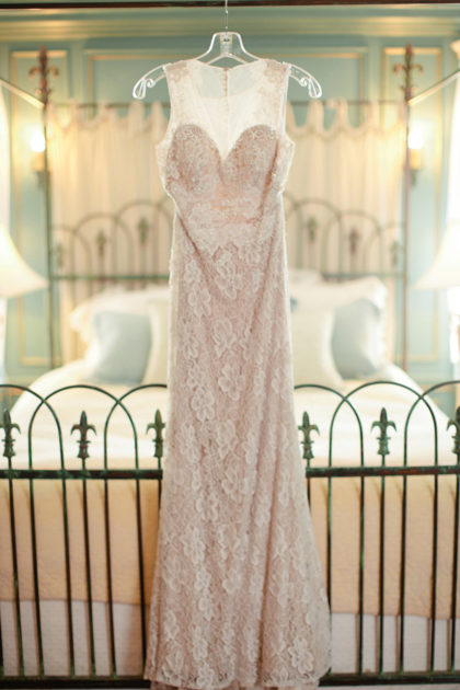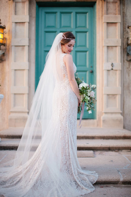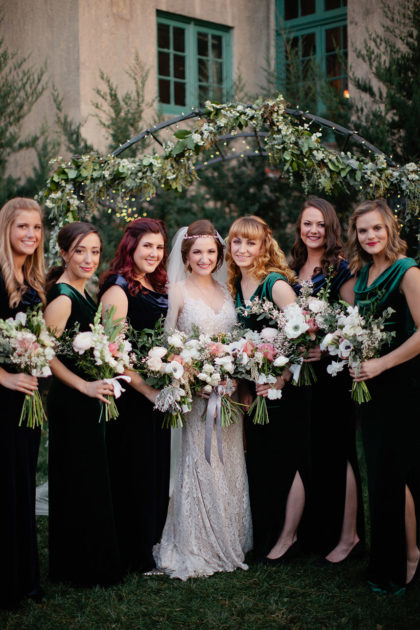 For the wedding, Alexandra went for a vintage-style cocktail party theme and chose vintage floor-length velvet dresses in deep jewel tones, including emerald and sapphire, for the bridesmaids. The rest of the decor was kept light and neutral to achieve a classic, vintage feel that was not overpowering. The groomsmen wore classic gray suits with black ties and black shoes. Alexandra’s dress was a vintage-inspired, ivory Leandra lace and bare stretch silk charmeuse sheath gown that showcased an illusion V-neckline and plunging back neckline with intricate scalloped lace detail. Adding to the memories, Alexandra looked gorgeous as she walked down the aisle in her grandmother’s earrings and garter from her wedding day in 1951. She also wore a unique handmade Paris by Moreland headpiece of gold and jewels.