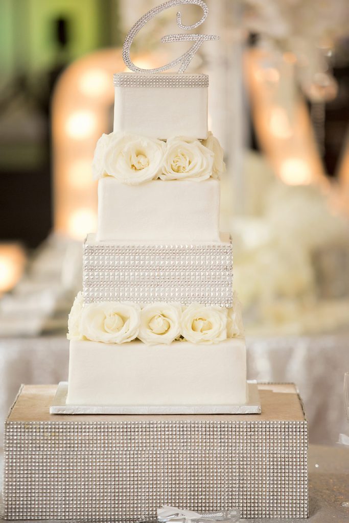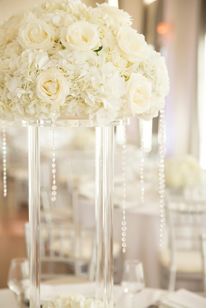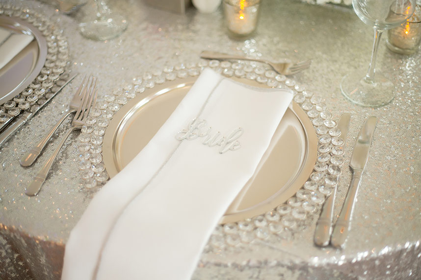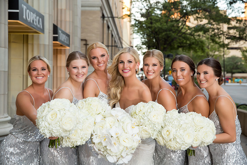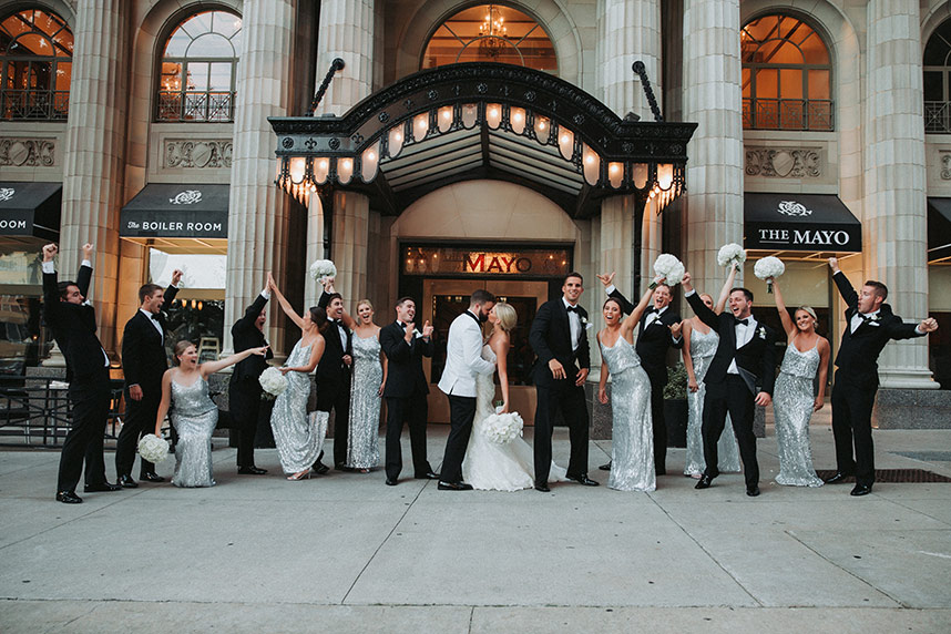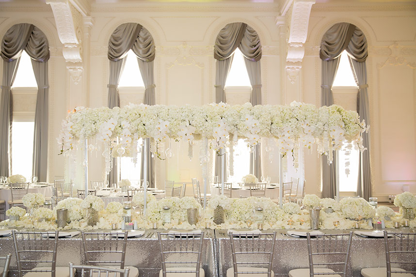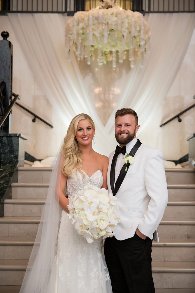The couple’s wedding day was everything they had hoped, thanks to their vendors who quickly became like family during the planning process. The elegant day featured bright whites with pops of silver sparkle. The Mayo Hotel effortlessly helped add to the elegance. A sequin aisle runner led to beautiful, white drapes dramatically hanging at the altar and the jaw-dropping floral chandelier handcrafted by Anne-Marie of The French Bouquet. The cocktail room consisted of modern, all-white couches and high cocktail tables with white sequin tablecloths topped with striking white floral arrangements. The head table centerpiece in the ballroom was exactly what Ali had in mind, but even more stunning.