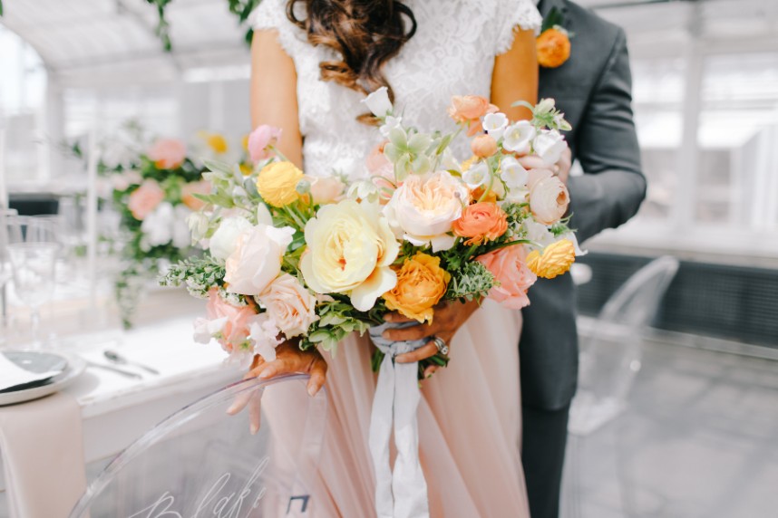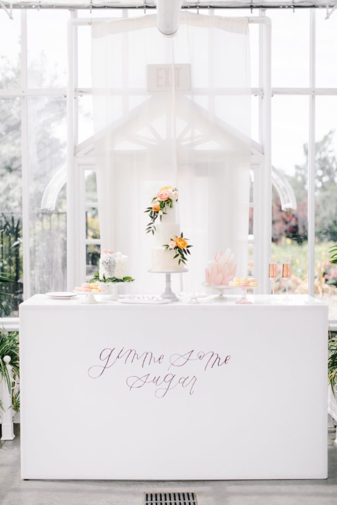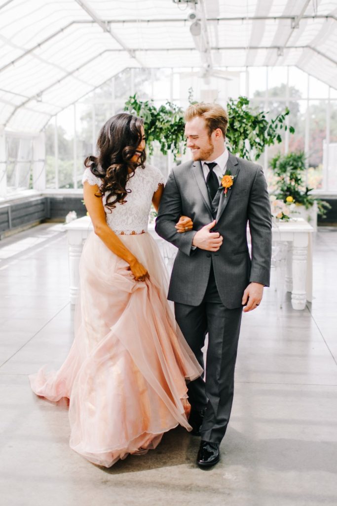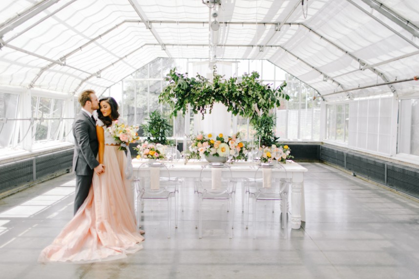 We’re swooning over this modern greenhouse wedding inspiration! Shot by Sarah Libby Photography, the fresh and airy vibe of this design is everything a spring or summer bride could hope for. Ever Something provided the most stunning florals, giving this setting the perfect pop of color, while Mood Party Rentals and Marianne’s Rentals supplied chic rental pieces to set the scene. The gorgeous model bride immediately steals the show in a breathtaking two-piece set, featuring a flowy peach skirt and lace top. Glam from our friends at AnnElyse Salon & Spa in combination with accessories from Chantilly Couture topped off her look. One-of-a-kind cakes from Amy Cakes truly wowed us! Their elegant yet uniquely modern design tied into the vision behind this shoot with ease. Keep scrolling for all of the Pinterest-worthy inspiration from this shoot, and don’t forget to check out some behind the scenes footage from this dreamy day thanks to Ripperton Films! Cheers!