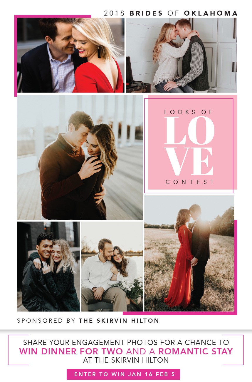 There are only a few days left to enter Brides of Oklahoma’s 10th Annual Looks of Love contest! We’ve been pouring over so many adorable submissions from Oklahoma couples already and can’t wait to announce our winner! To enter, follow this link and upload a few of your favorite pictures or engagement photos and briefly tell us your love story (just a short paragraph will do!). The deadline to enter is next Monday, February 5. We’ll be sharing some of our favorites for voting starting Wednesday, February 7, leading up to the big announcement on Valentine’s Day! The Looks of Love entry with the most likes will win a dinner date for two at a restaurant of their choice on us, a romantic overnight stay at The Skirvin Hotel AND breakfast at The Skirvin’s Park Avenue Grill on a mutually agreed upon date! Also, if you have any friends in the DFW, Austin or Houston areas, be sure to tell them about our Looks of Love Contest for Brides of North Texas, Looks of Love Contest for Brides of Austin or Looks of Love Contest for Brides of Houston ongoing now as well! Good luck!