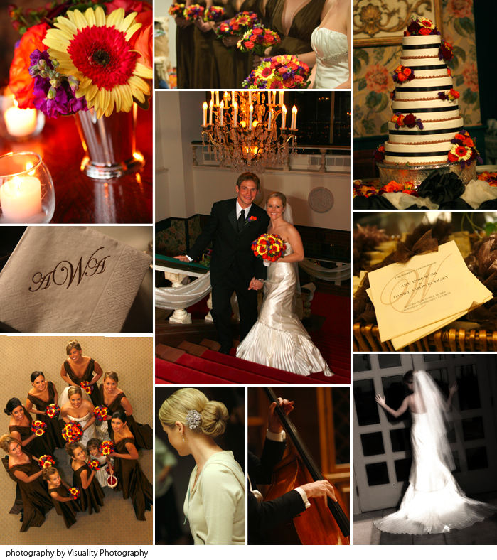 The Webb/Woolsey wedding was featured on page A54 in the January, 2008 issue of The Brides of Oklahoma magazine. With a base palette of brown and ivory, the bride added an incredible vibrant feel by using colorful florals. Oklahoma florist, Flowers by Pat, used bright, gerbera daises, roses in tones of burgundy and orange and royal purple stock to complement the bridesmaids’ nutmeg Vera Wang gowns with dramatic plunging neckline – all of J.J. Kelly Bridal. The bride chose a dazzling Jim Hjelm Couture gown in diamond white silk. We absolutely loved her stylish pleated train! The classic wedding reception was held atop the highest building in downtown Oklahoma City at the Petroleum Club. Guests danced the night away to the sounds of Moonlight Serenade booked through Box Talent Agency and the bride even arranged for an old-fashioned photo booth for guests to enjoy! For your photo booth needs, we suggest Tulsa Photo Booth (they will travel!) – just ask for Jesse! The wedding was captured by Oklahoma photographer, Visuality Photography, and Oklahoma videographer, III Oaks Video Production.