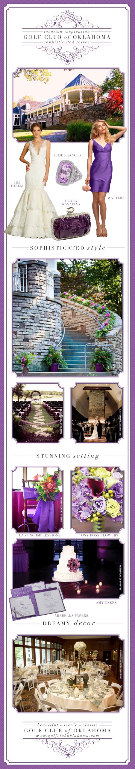 Located just outside the bustling city of Tulsa, The Golf Club of Oklahoma is a hidden gem that is perfect for a sophisticated soiree! Inside the clubhouse you’ll find rich, dark mahogany tones and a large stone fireplace. Outside is a gorgeous wrap around white pillar porch that leads guests onto a grassy lawn where weddings can be held overlooking picturesque waters on the site. We couldn’t wait to share some inspiring wedding details for a fabulous affair at this luxe location. Dressed in a lace, trumpet gown from Jim Hjelm, you are sure to stand out! Jim Hjelm Bridal is available locally at Meg Guess Couture. Paired with a lovely lavender Jude Frances ring, available at Cayman’s and Naifeh Fine Jewelry, and a plum snakeskin clutch from Luxe Objects, you’ll create the ultimate wow! And there’s no denying the effortless beauty your bridesmaids will have in a chic purple Watters bridesmaid dress, available at J.J. Kelly Bridal Salon. Beautiful flowers like a grand petal covered aisle to the altar, fab chair treatments like this from Lasting Impressions, and a lovely bouquet like this beautiful lavender bouquet by Tony Foss Flowers will fit perfectly into this scenic setting. Add a dreamy cake like the textured beauty from Amy Cakes and darling patterned invites like this Arabella Paper suite, available at By Invitation Only and Paper ‘N More, to finish off this classic look. Go online to find out more about the Golf Club of Oklahoma and start planning your sophisticated soiree!