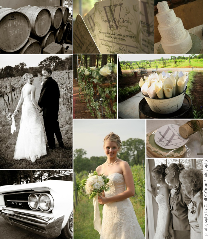Amanda Rose Watson, an Oklahoma bride featured in The Brides of Oklahoma magazine on pages A12 and A13, planned a beautiful indoor/outdoor wedding at a local Oklahoma winery and incorporated lots of vintage touches. Her chosen shades of white, celadon and sage blended beautifully with the natural surroundings of the venue. At each place setting, the bride’s grandmother shared her time-honored butter cookies which were decorated with the couple’s monogram. The four-tiered French vanilla wedding cake with Danish apple filling had fondant detailing that replicated the bride’s Casablanca lace gown. Oklahoma photographer, Candi Coffman, captured every detail of the setting and the day from the collection of old wine barrels to the bride and groom sharing a walk outside among the rows upon rows of perfectly pruned vines. Sticking true to the vintage theme, the get-a-way car was a 1964 Pontiac GTO, restored and owned by the groom’s father. Marianne’s Rentals in Oklahoma City provided the rentals and linens for the evening. For more pictures from the Rose-Watson wedding, check out their real wedding gallery in The [B] Galleries online now.