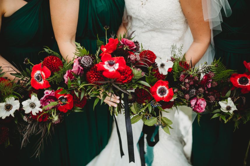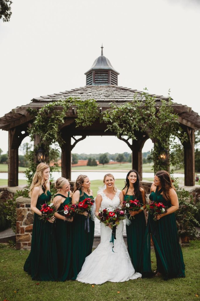 This bride’s adorable giddiness at the altar warms our hearts! Held at the stunning Oak Tree Country Club, this beautifully moody wedding is so full of gorgeous elements, we can’t wait for you to see them all. A strong palette of emerald, black and deep ruby contrast, while pops of elegant gold, champagne and crystal decor from Marianne’s Rentals work to elevate the luxe factor. Clara and all her bridesmaids look so stunning with custom artistry by Brushed Salon and Makeup Studio suited to perfectly complement each bridal party member’s best features. With delicious catering courtesy of the venue as well, this wedding truly has it all. Our favorite part of this big day is the adorable giddiness the bride had at the altar – the look on her face truly says it all. We highly recommend marrying your best friend! Cheers to Clara and Trevor!