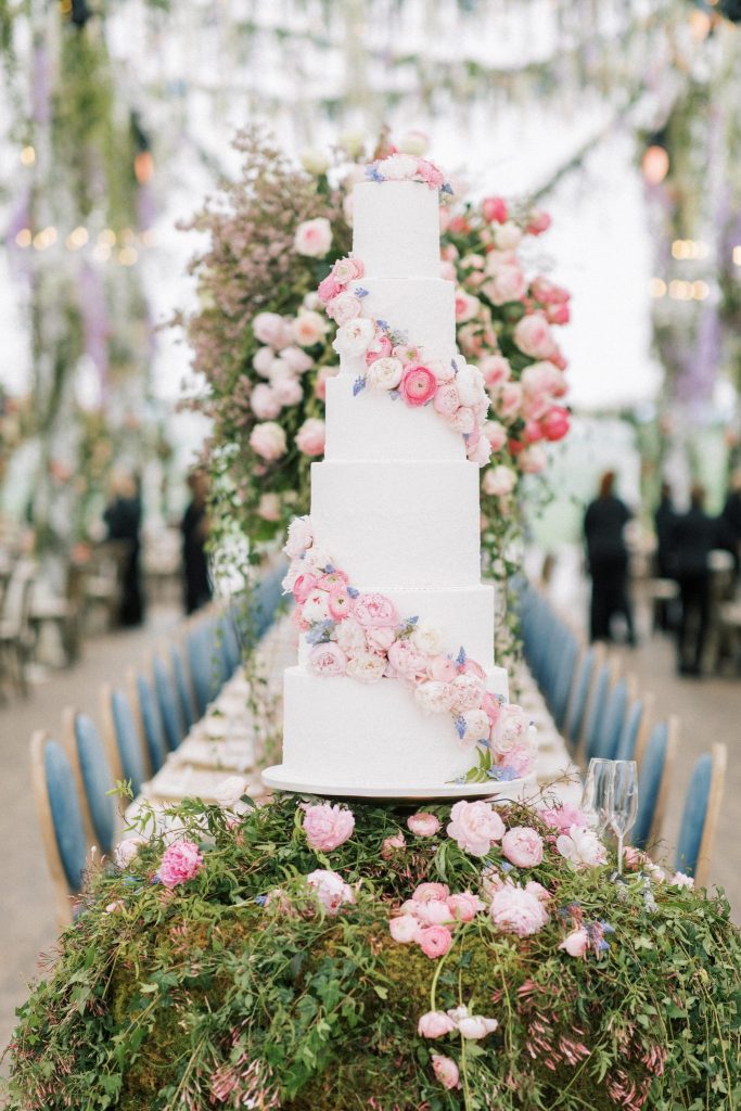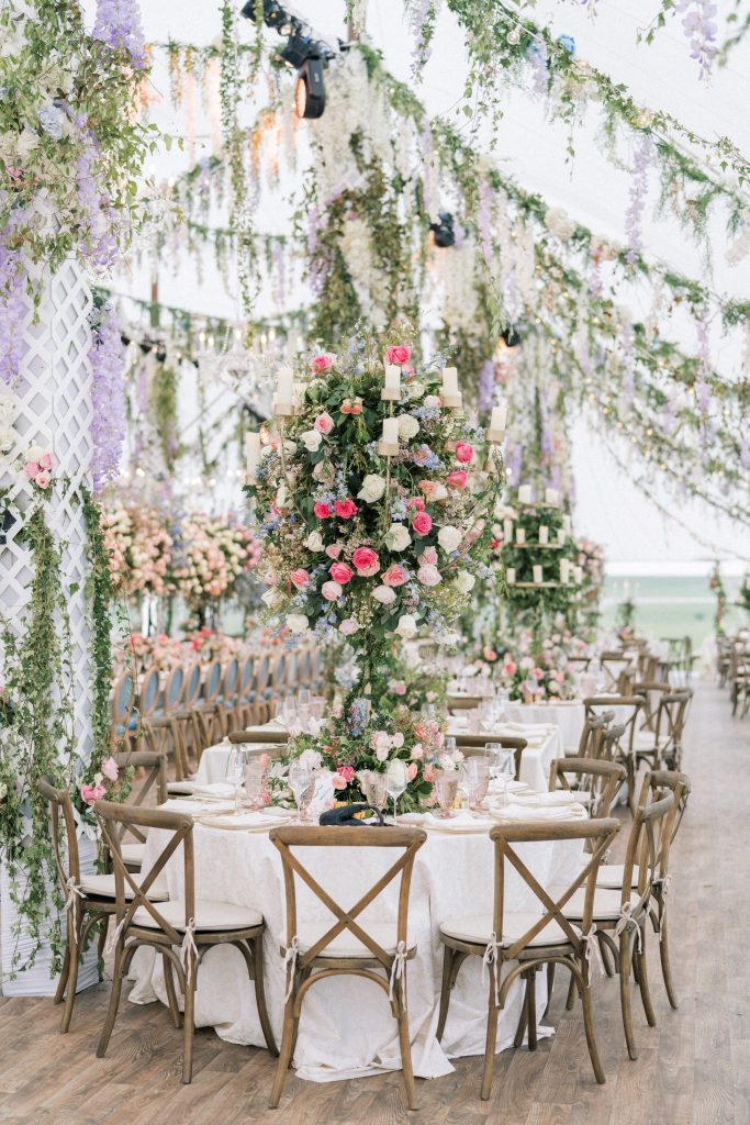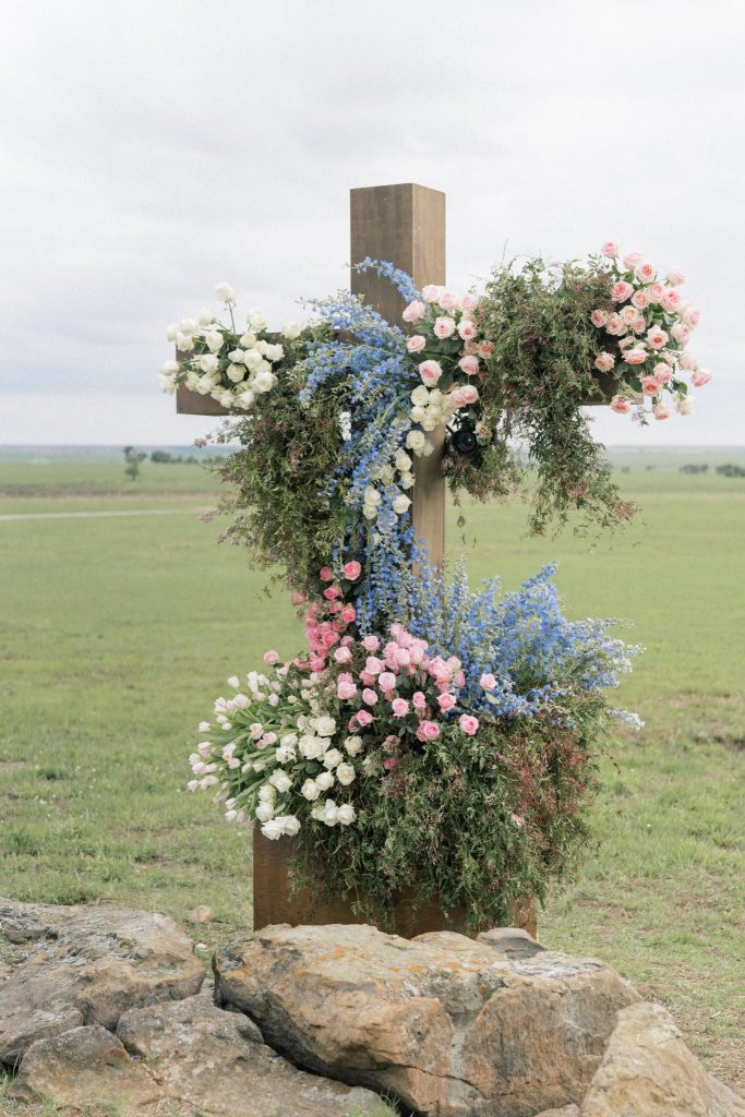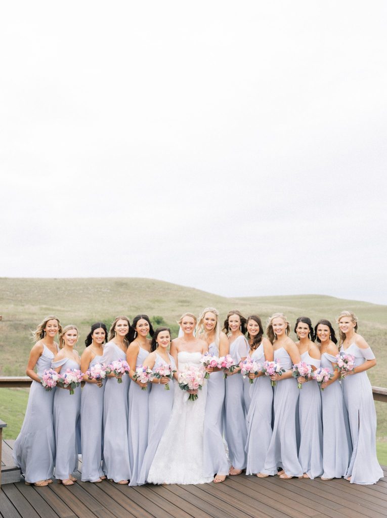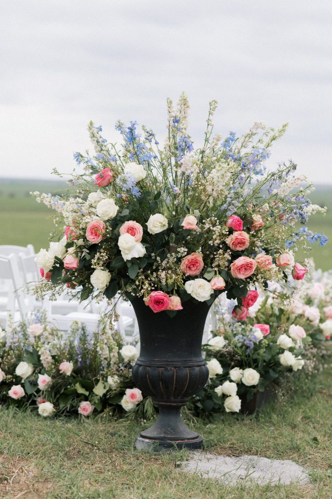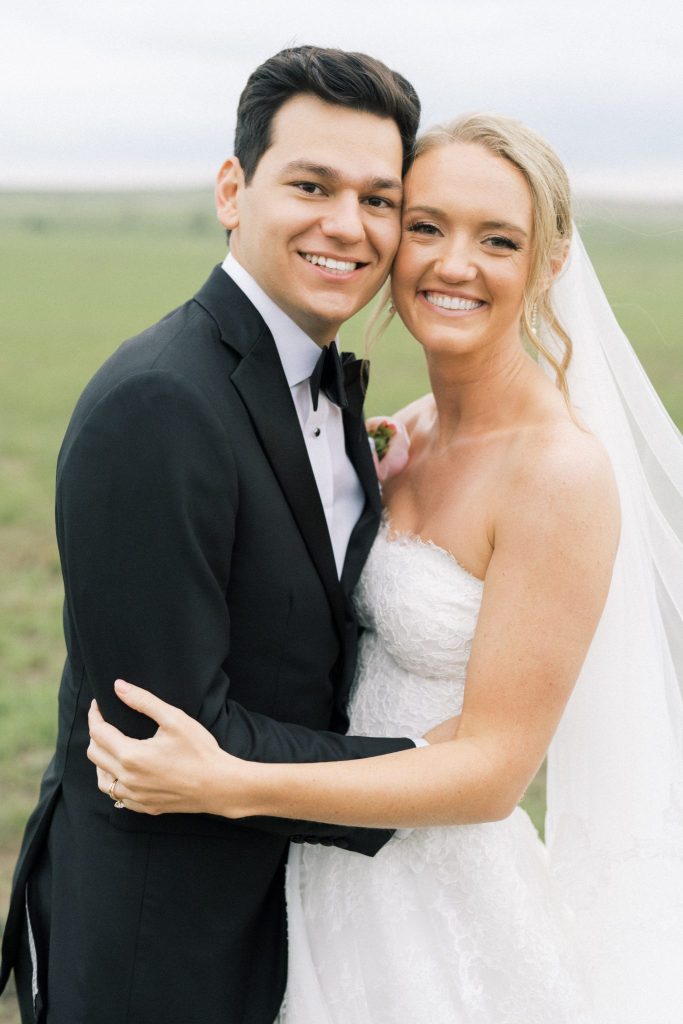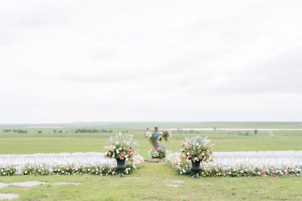 It only took us one look to be completely captivated by the abundant soft-toned pink, blue and purple florals that adorned every aspect of this scene – from lining the aisle to the altar that overlooked the ranch, to the perfectly placed tabletops, to almost every inch of space encapsulated under the billowy sail tent from Party Pro Rents – The Fleuriste truly outdid themselves with this masterpiece of eclectic florals that pop so well against the lush natural landscape. Hanging greenery and wispy wisteria blew in the gentle Oklahoma breeze all night as guests partied the night away and ate scrumptious slices of cake from Amy Cakes. The six-tier showstopper of a cake, adorned with more of those iconic florals and hand-made edible lace to duplicate the lace featured on Alex’s bridal gown, filled with strawberry and white layers was just the cherry on top of it all! When looking back at all of her vendors, Alex says that “we had the most amazing team of talented people, and we are so grateful.” She adored every single one of them, from her florist, entertainment, photographer and team of hair and makeup artists consisting of MLB Artistry for the ultimate bridal glam!