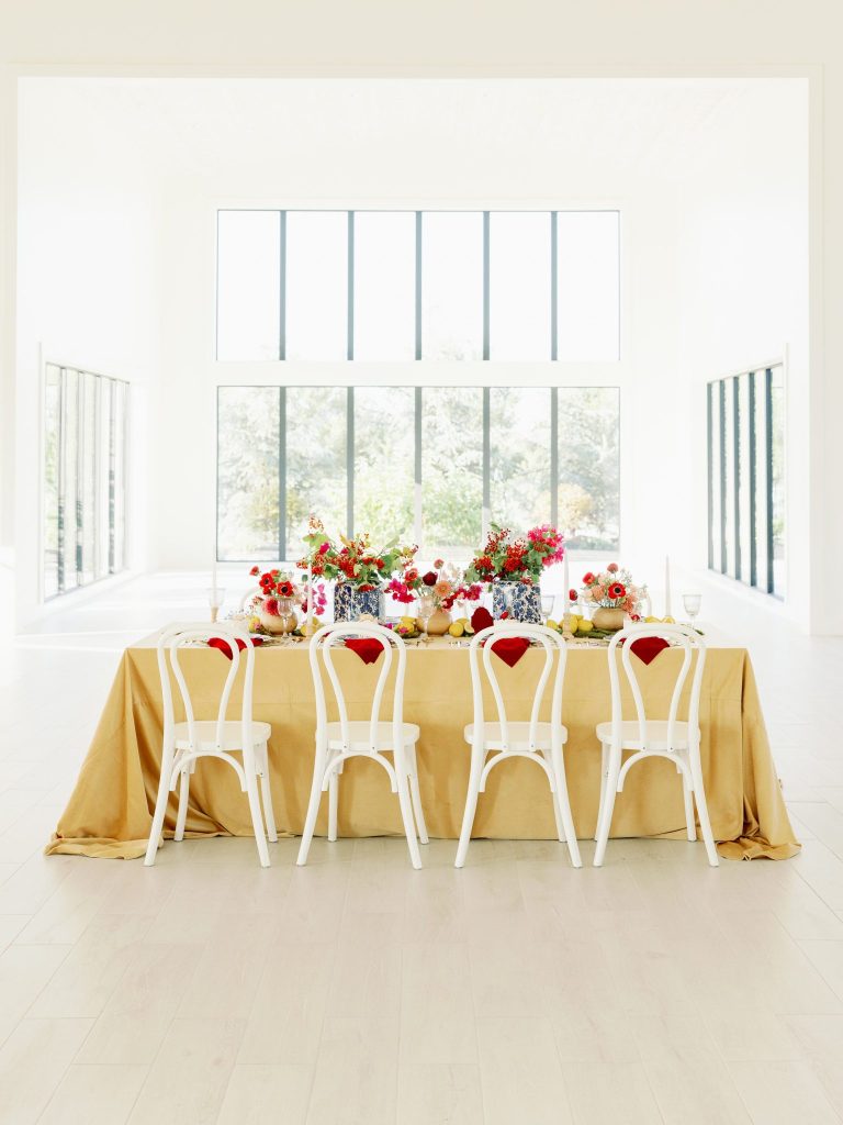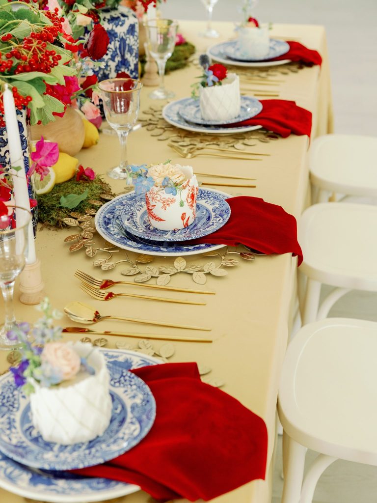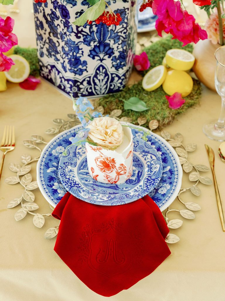 From Tara with Fête: “We wanted to capture something beautiful yet colorful and also unique to showcase our ability to create one of a kind visions for our couples. That led us to an Italian countryside vibe with all the bright colors and blue and white elements.”