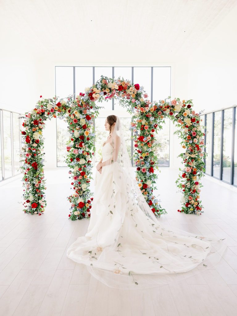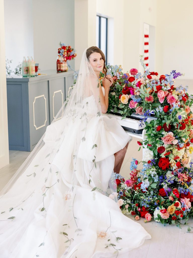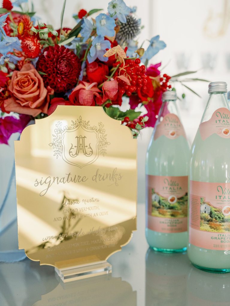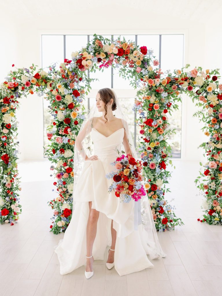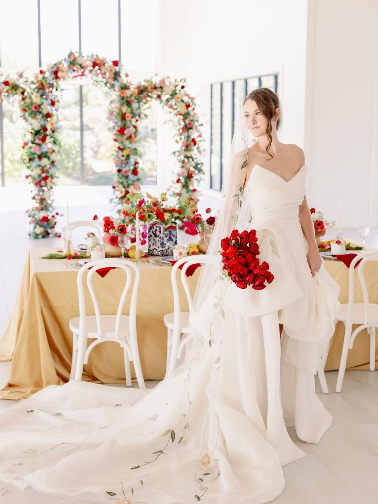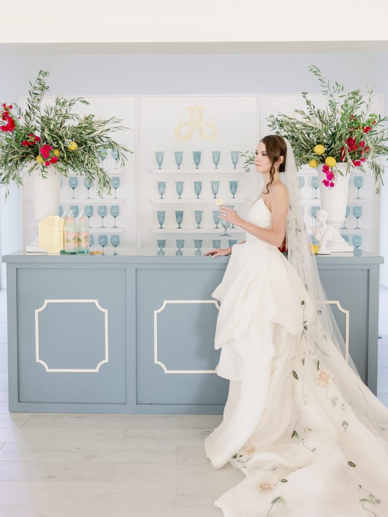 Ciao, Bella! Inspired by the Amalfi Coast, the planners at Fête are giving us all the colorful Italian wedding inspiration. The bright and soft hues captured at Aspen Ranch take us straight to the southern Italian coastline. Italians are well acquainted with the delights of entertaining and grand tables. With this in mind, the planners at Fête created a table spread fit for an Italian wedding affair. Blue and white dinnerware paired with a deep red velvet monogrammed napkin from Wooden Hearts Boutique and luscious bright blooming floral arrangements from XO by Hayleigh Kenney completed the tablescape. Wooden Hearts Boutique and Hayleigh Kenney also brought all the romance with a triple arch floral design as the table backdrop. In order to have an authentic Italian experience, you can’t pass up on a sweet Italian drink at the bar by Mood Party Rentals. A limoncello would be our choice of Italian drink if we were ordering off the custom bar signage from Wooden Hearts Boutique. From beginning to end, Joanna with Eros Studios brought all the whimsical romance with an Italian invite suite and an interlocking custom monogram used throughout the shoot. The interlocking monogram is a hot trend right now but also gives a nice nod to old traditions. Similar to the structured ball gown from J.J. Kelly Bridal Salon. This dress gives a traditional ball gown a fun modern twist with a short front to show a powerful leg moment. We also can’t help but be whisked away by the cathedral-length floral-embroidered veil from J.J. Kelly as well. Brushed Salon agreed that the hair and makeup look had to complement the show-stopping dress and veil. Therefore they created a fun and glowy beauty look that added to all the fun. The hair included an elegant updo with a series of twists and dramatic side-parted bang that accented the model’s beautiful features and neck. A playful peachy lip, cheeks, and eyes added a flirty but sophisticated look to the dress. Finally, we have not been able to stop eyeing the personal-sized cakes from Amy Cakes. Yes, that is right, a personal-sized cake from Amy! OBSESSED! The talented Danielle Villemarette & Co. captured all the bright and colorful Italian images that have us swooning for days. Keep scrolling to see more and read a special note from the planners at Fête.