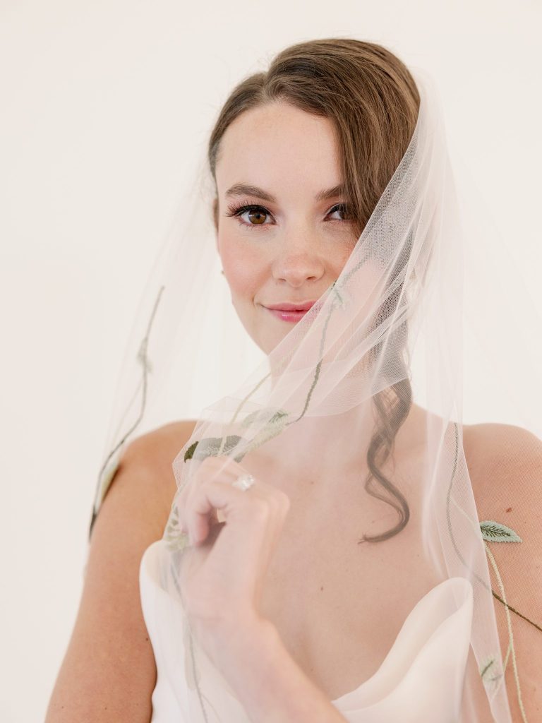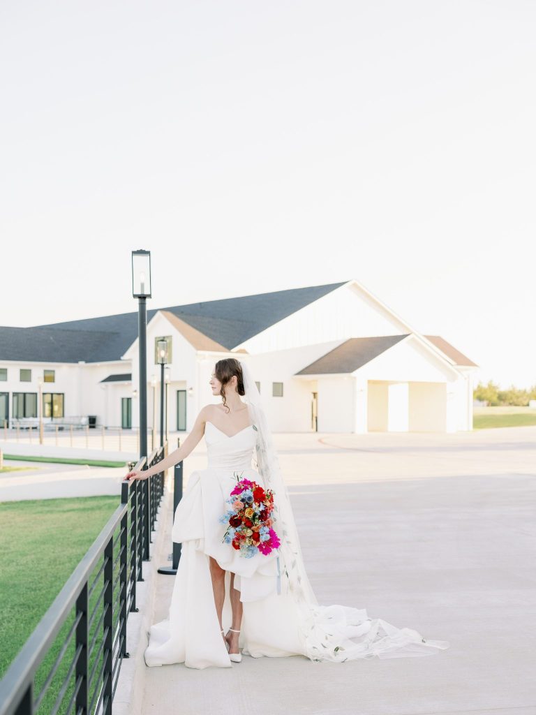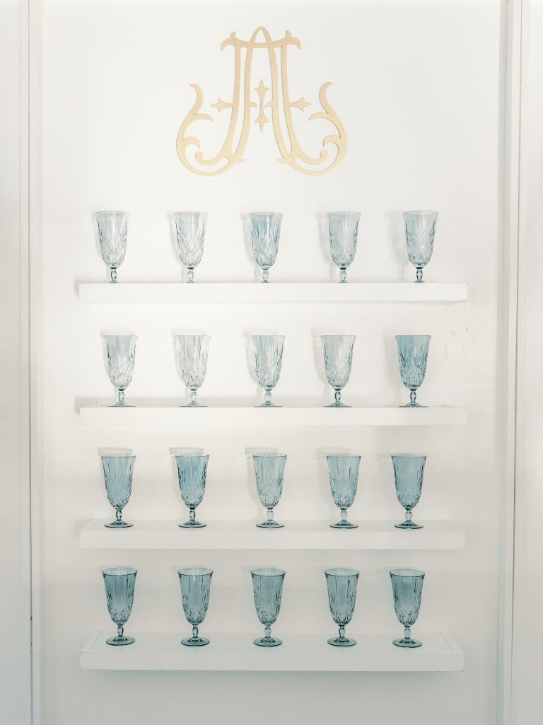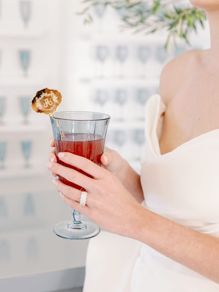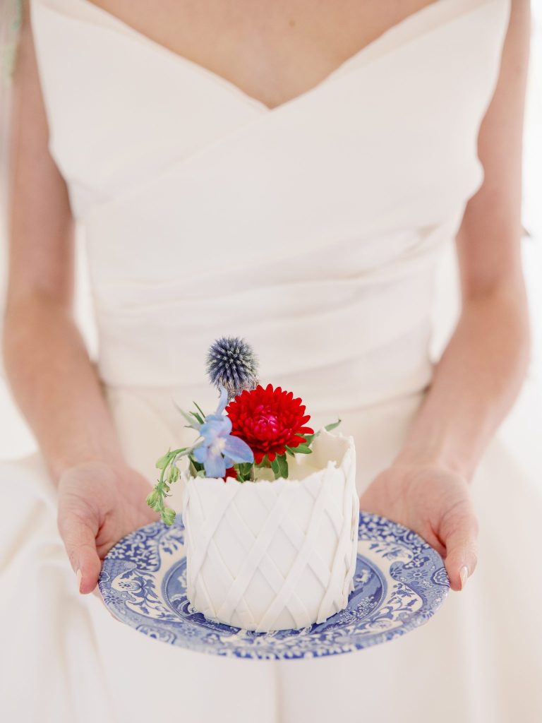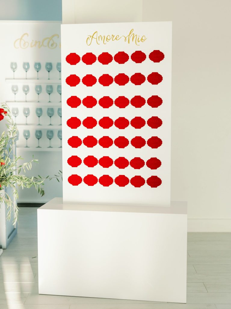 Ciao, Bella! Inspired by the Amalfi Coast, the planners at Fête are giving us all the colorful Italian wedding inspiration. The bright and soft hues captured at Aspen Ranch take us straight to the southern Italian coastline. Italians are well acquainted with the delights of entertaining and grand tables. With this in mind, the planners at Fête created a table spread fit for an Italian wedding affair. Blue and white dinnerware paired with a deep red velvet monogrammed napkin from Wooden Hearts Boutique and luscious bright blooming floral arrangements from XO by Hayleigh Kenney completed the tablescape. Wooden Hearts Boutique and Hayleigh Kenney also brought all the romance with a triple arch floral design as the table backdrop. In order to have an authentic Italian experience, you can’t pass up on a sweet Italian drink at the bar by Mood Party Rentals. A limoncello would be our choice of Italian drink if we were ordering off the custom bar signage from Wooden Hearts Boutique. From beginning to end, Joanna with Eros Studios brought all the whimsical romance with an Italian invite suite and an interlocking custom monogram used throughout the shoot. The interlocking monogram is a hot trend right now but also gives a nice nod to old traditions. Similar to the structured ball gown from J.J. Kelly Bridal Salon. This dress gives a traditional ball gown a fun modern twist with a short front to show a powerful leg moment. We also can’t help but be whisked away by the cathedral-length floral-embroidered veil from J.J. Kelly as well. Brushed Salon agreed that the hair and makeup look had to complement the show-stopping dress and veil. Therefore they created a fun and glowy beauty look that added to all the fun. The hair included an elegant updo with a series of twists and dramatic side-parted bang that accented the model’s beautiful features and neck. A playful peachy lip, cheeks, and eyes added a flirty but sophisticated look to the dress. Finally, we have not been able to stop eyeing the personal-sized cakes from Amy Cakes. Yes, that is right, a personal-sized cake from Amy! OBSESSED! The talented Danielle Villemarette & Co. captured all the bright and colorful Italian images that have us swooning for days. Keep scrolling to see more and read a special note from the planners at Fête.