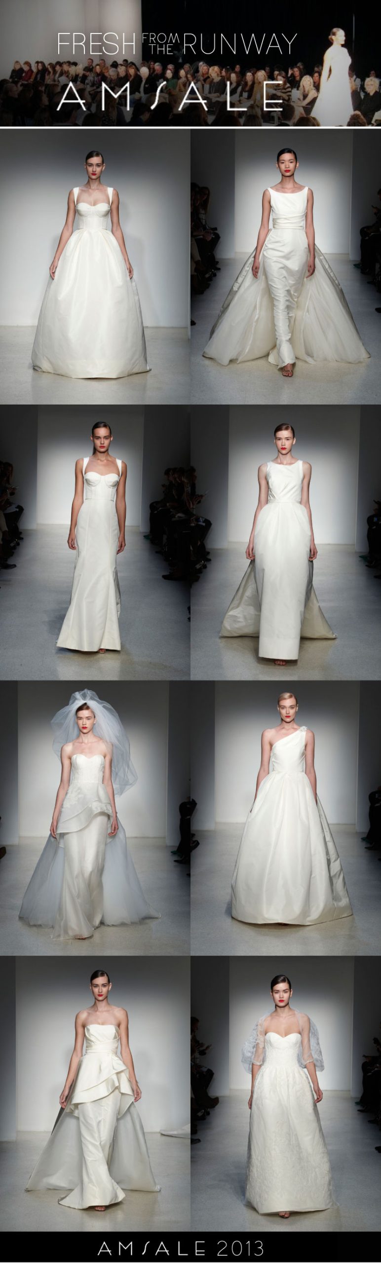 We are beyond excited to begin sharing some of the latest wedding gowns straight from the New York International Bridal Week runways! We’re kicking things off with lovely looks from Amsale. A “celebration of American couture,” Amsale’s fall 2013 collection features luxe fabrics, archetypal shapes and perfectly edited details. Each design offers a unique sculpted look and is perfect for a modern bride! Enjoy!