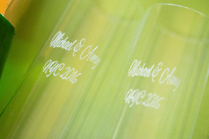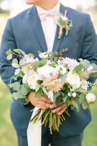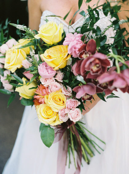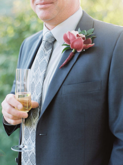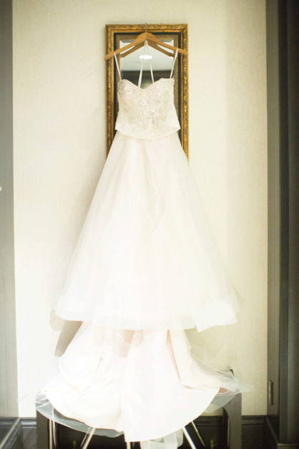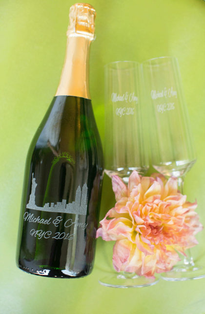 Amy looked stunning in her gown, which had a beaded bodice and blush tulle skirt. She kept her jewelry simple by wearing a diamond bracelet and diamond earrings, and she carried a bouquet of yellow roses, blush garden roses, blush and orange dahlias, wine-colored orchids and Italian ruscus. The couple was also gifted a personalized champagne bottle and toasting glasses to always remember their special day.
