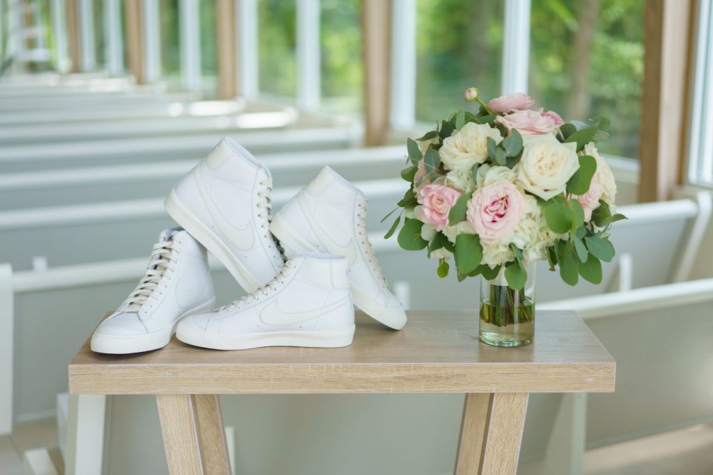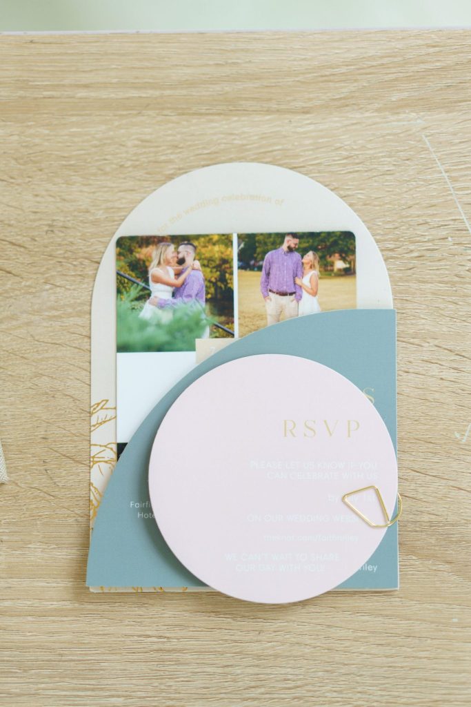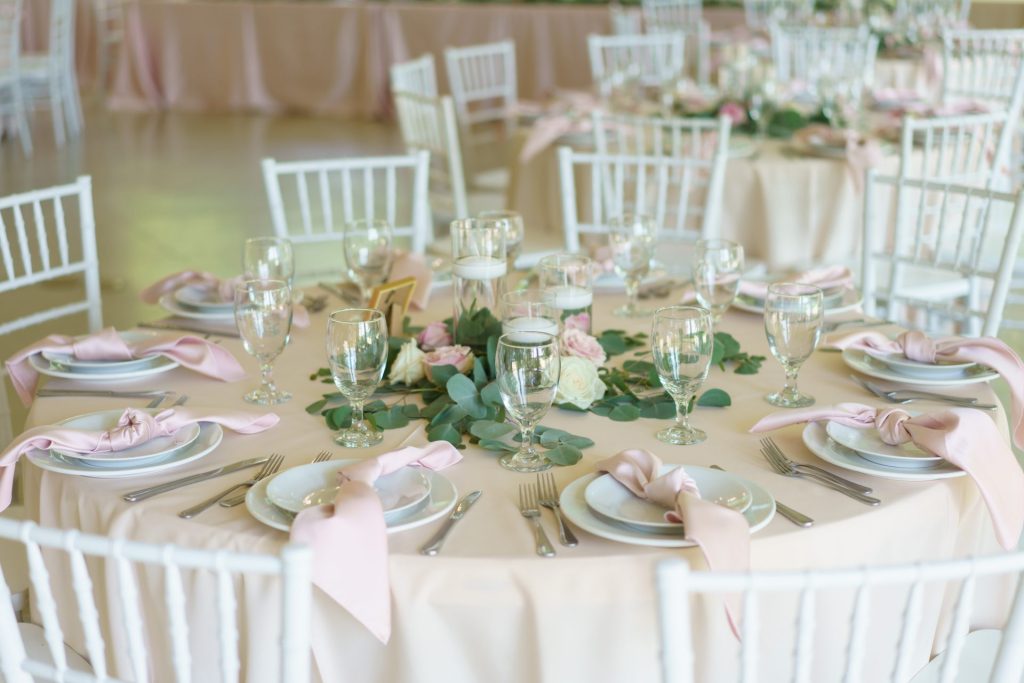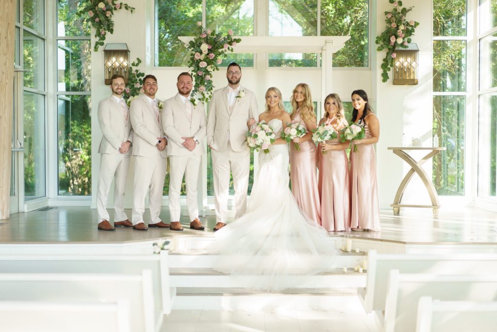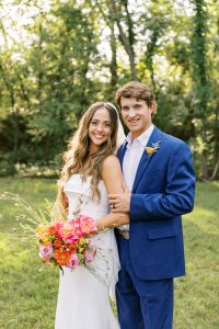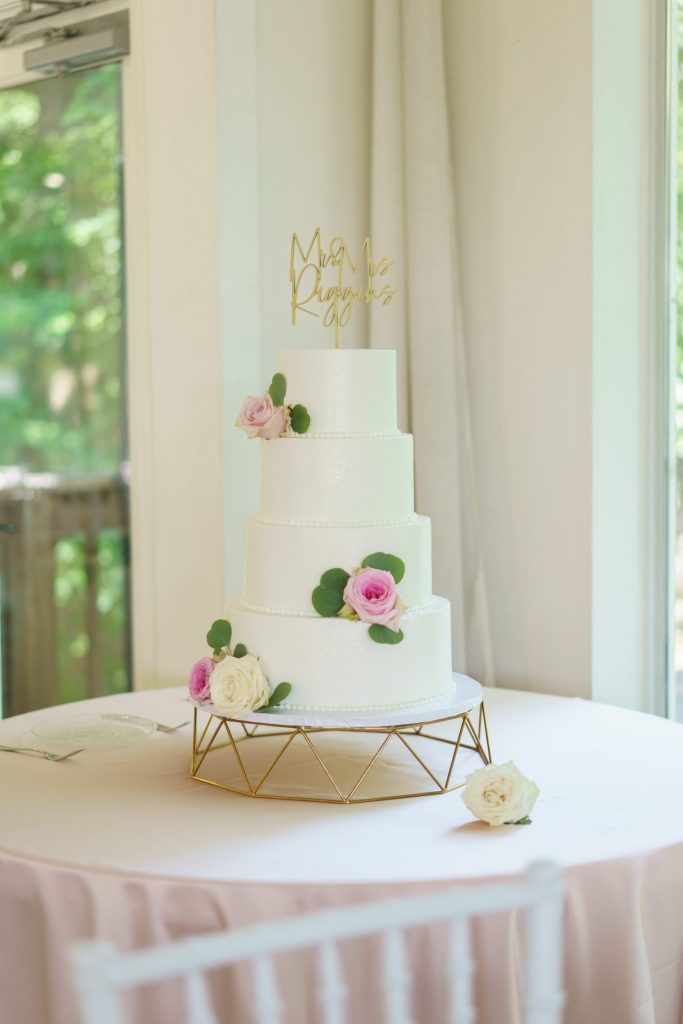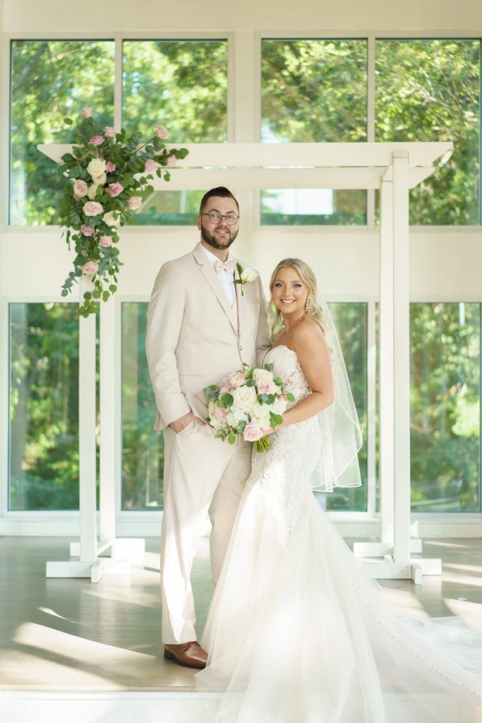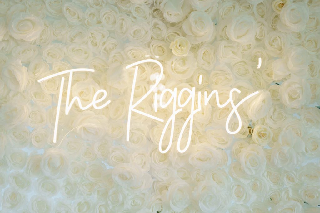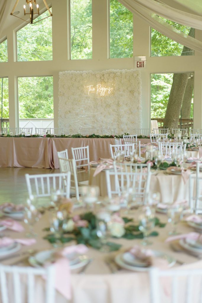 “Our day was a dreamy, summery wedding full of pinks and gold accents in the decor and florals. My vision was an elegant, timeless, yet dreamy summer look at the same time. The venue totally encapsulated this look and all the pieces came together, from our white rose flower wall and neon sign to the floral touches around our arbor. It was truly amazing and a perfect summer evening in July!” – Faith, Bride