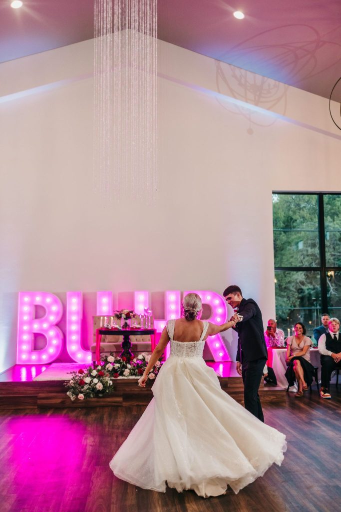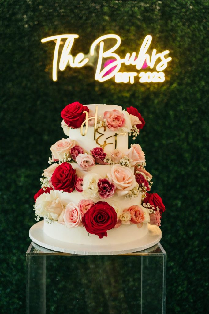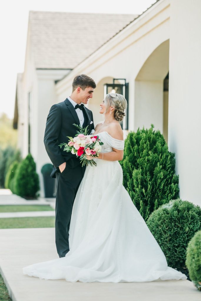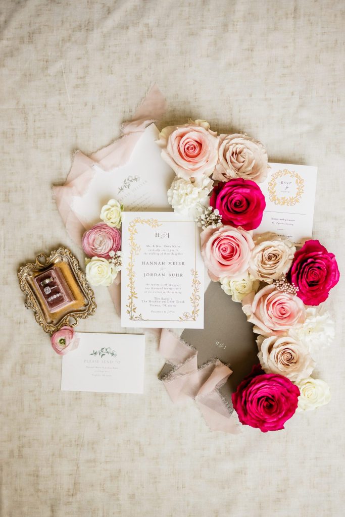 “Hannah dreamed up a beautiful wedding! Timeless and fairytailesque. She chose different shades of pink to pop against the softness of her gown and paired it with a cathedral veil. Her dress, his tux, lush florals, with pops of gold were a dream to photograph!” – Haley Bronwen Photography