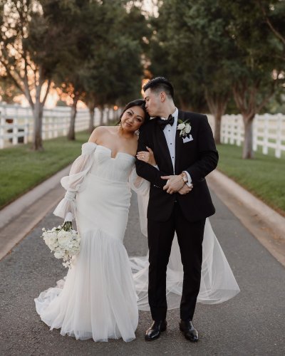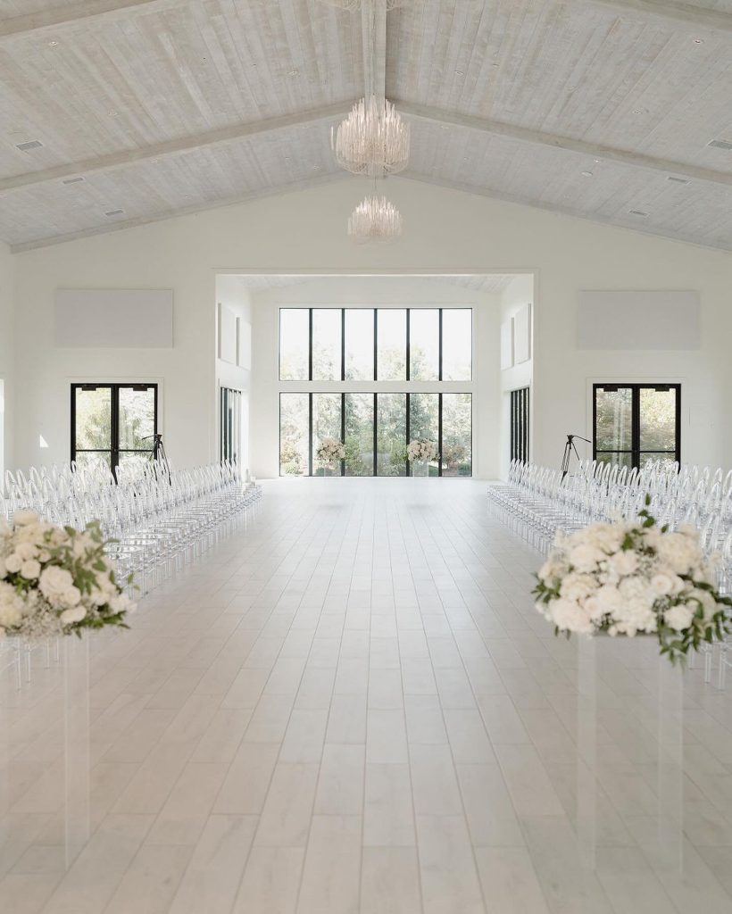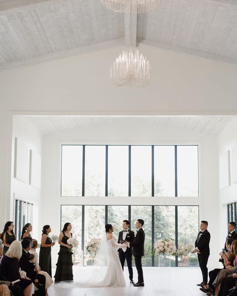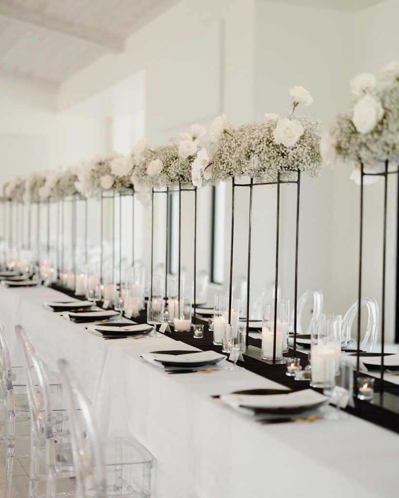 Jackie + Robin exchanged vows in a breathtaking ceremony at the sophisticated Aspen Ranch, elegantly blending classic black + white themes with contemporary touches, including innovative runway-style ceremony seating.