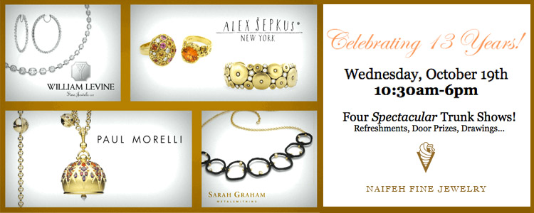 Join Naifeh Fine Jewelry as they celebrate 13 incredible years of business! Four spectacular trunk shows, refreshments, door prizes and drawings – oh my! Plus, Naifeh Fine Jewelry will pay the sales tax on all purchases all day. Go see what’s hot, what’s new and what fabulous baubles look good on you!
