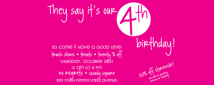 No Regrets will be celebrating their 4th birthday in style! Swing by their shop Thursday, October 28, from 10 am to 6 pm for trunk shows, treats and 20% off! You won’t want to miss this fun celebration. Be sure to stop by their store located at 9300 North Pennsylvania Avenue, Oklahoma City, in Casady Square. Enjoy!