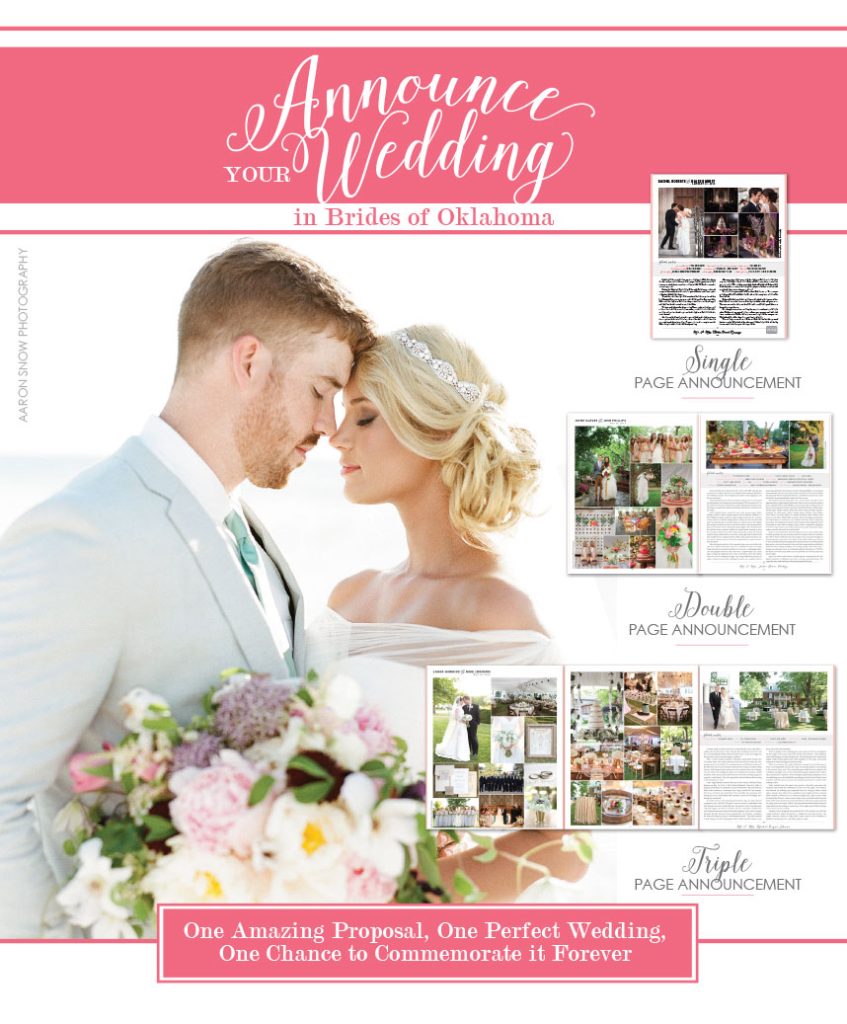announceyourwedding_fw2015_boo_blogIf you’re looking for the perfect keepsake and a great way to commemorate your big day, announce your wedding in Brides of Oklahoma magazine! All announcements are full-color and include several pictures along with a write-up! Brides can choose from a single, double or triple page wedding announcement. You can compare sizes and pricing here. The deadline to submit your completed wedding announcement packet for the upcoming January issue is coming up on October 1st. Be sure to reserve your spot online right away — space is limited! Easily reserve your wedding announcement space online here. To make things even easier, you can now fill out the information portion of the packet online — https://www.thebridesofoklahoma.com/wedding-details! If you have any questions, email Jennifer at [email protected] or call 405.607.2902.