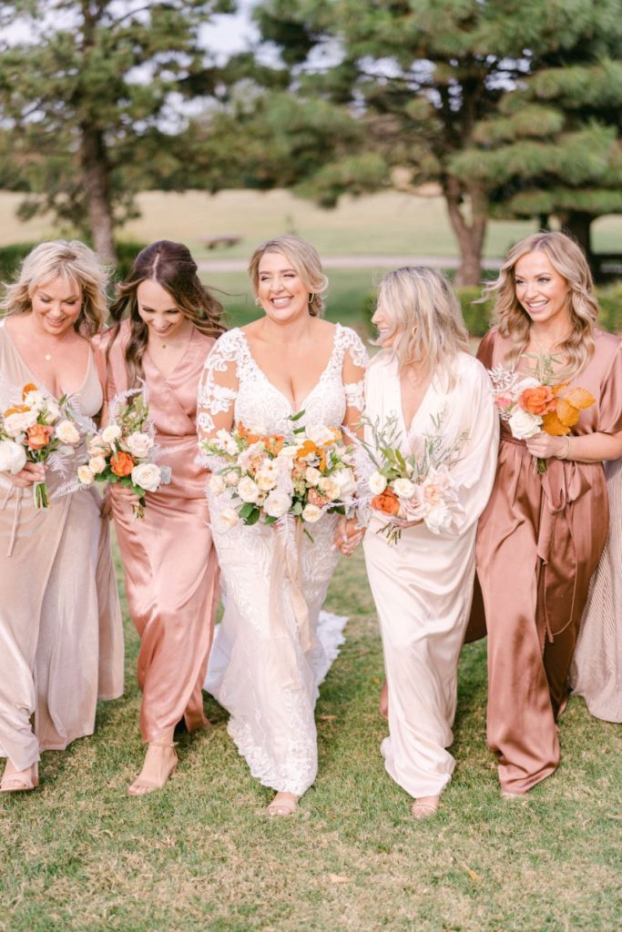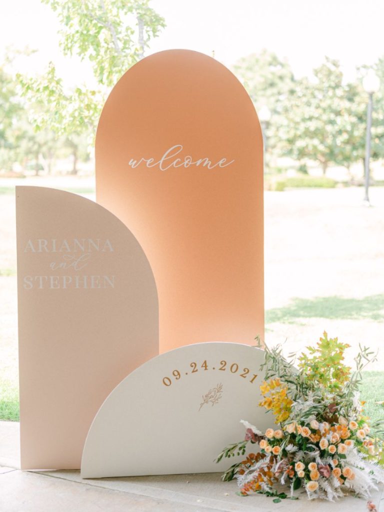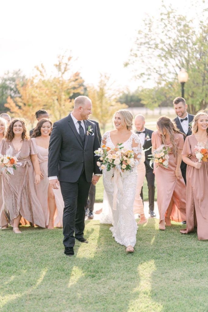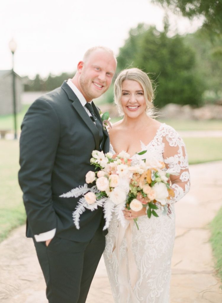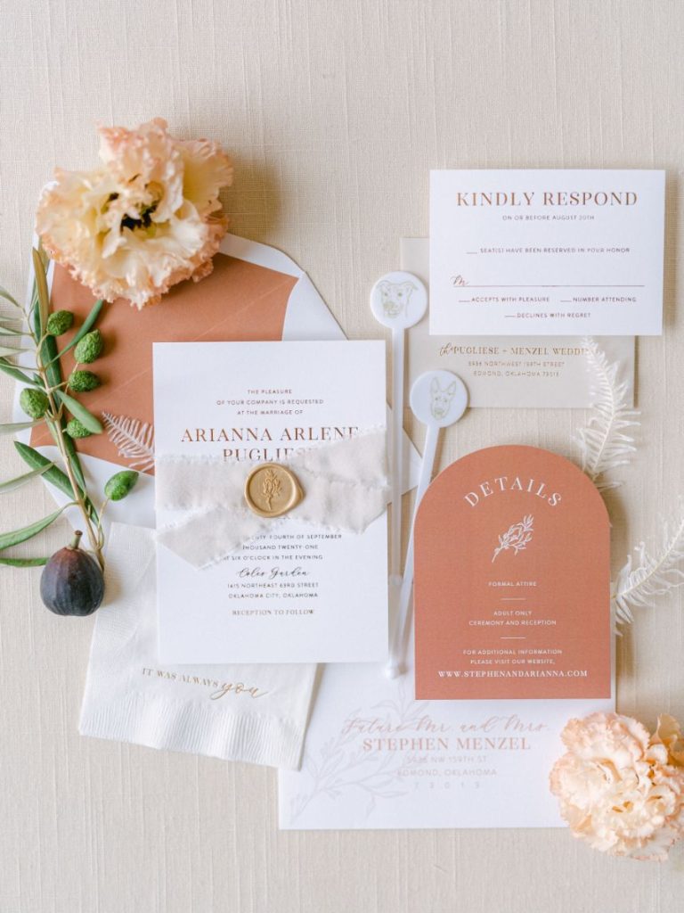 The terracotta details within Arianna and Stephen’s big day create the chic bohemian aesthetic that we love so much! From florals to table numbers to the invitation suite from Eros Studios, every wedding detail contained the beautiful and trendy terracotta color! As we all know, some of the most beautiful weather in Oklahoma happens in September. Arianna and Stephen took advantage of the fall temps and had their ceremony outside. Arianna walked down the aisle under three center arches lining the aisle from Wooden Hearts Boutique filled with greenery and terracotta blooms from Poppy Lane Design. Amanda Watson Photography’s images of the couple under the floral arches are some of our absolute favs from the day!
