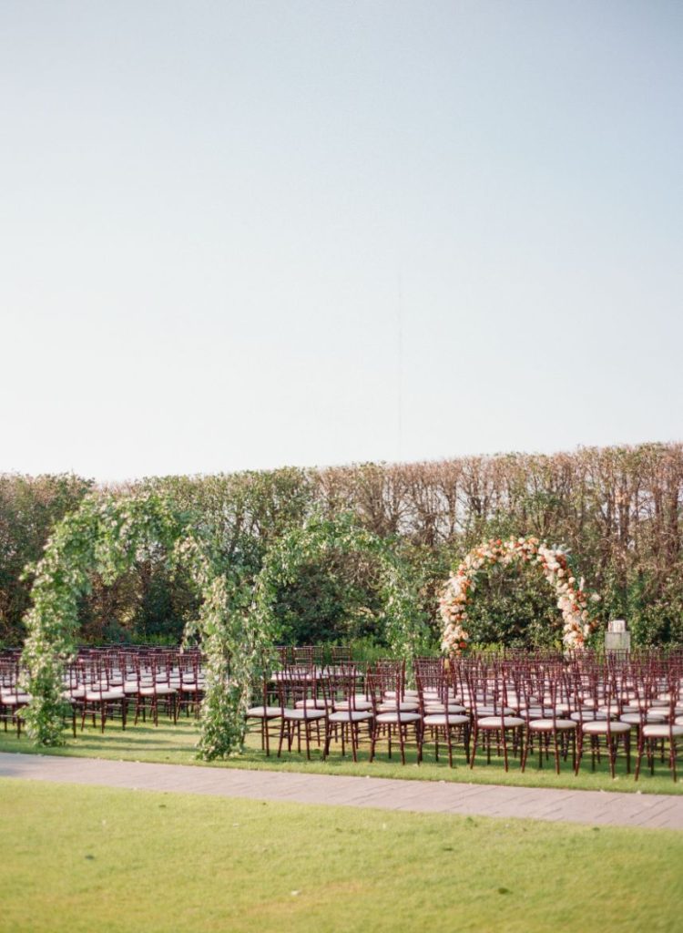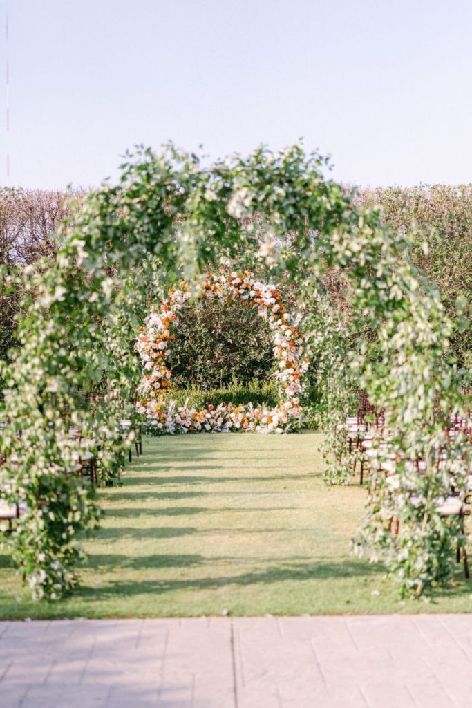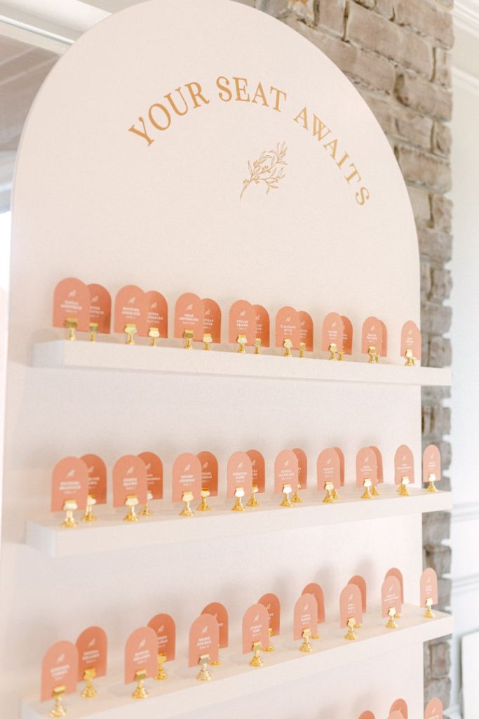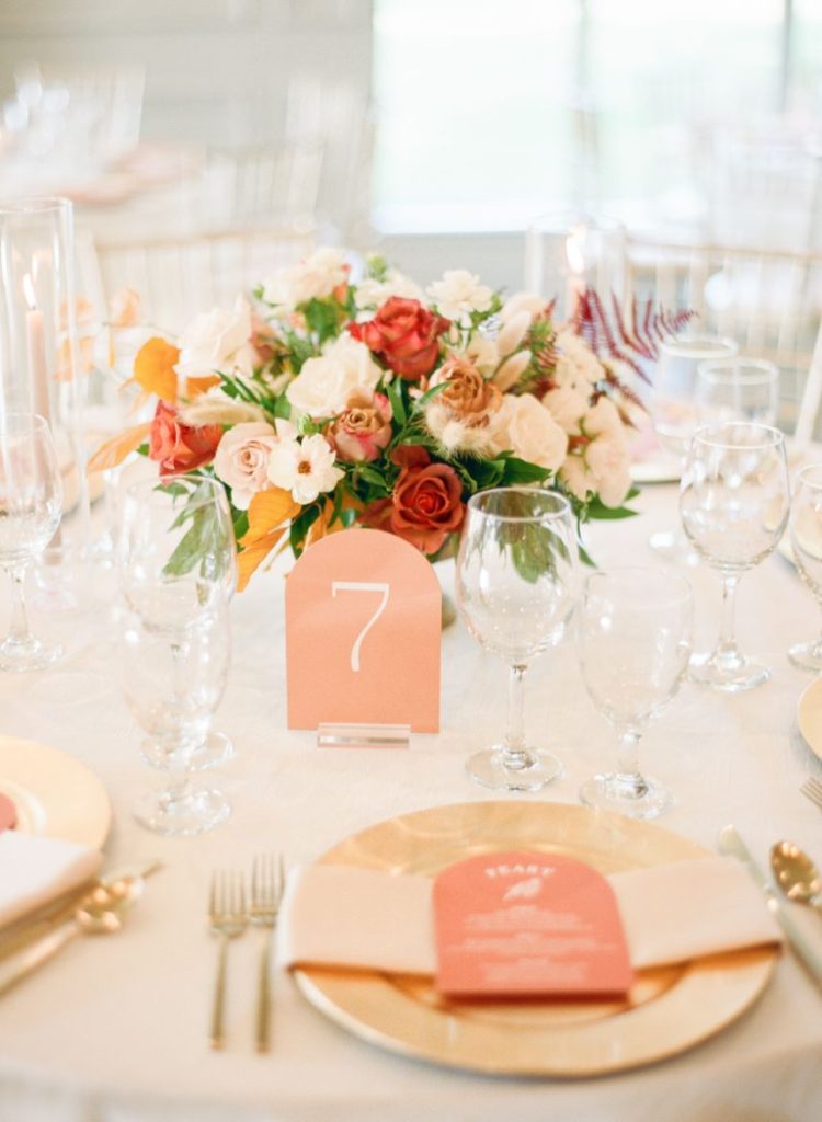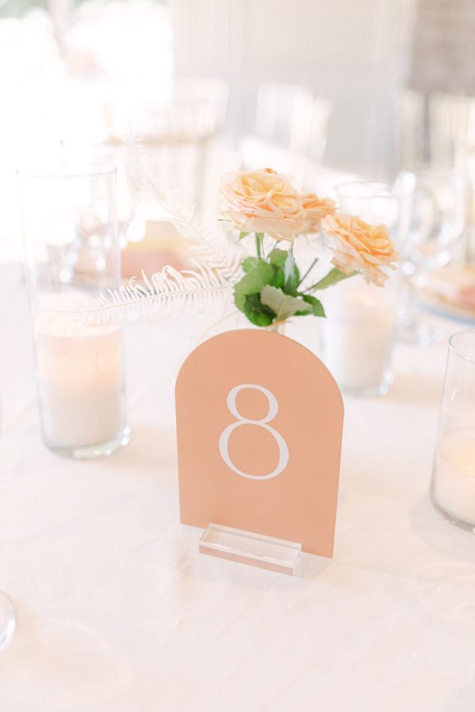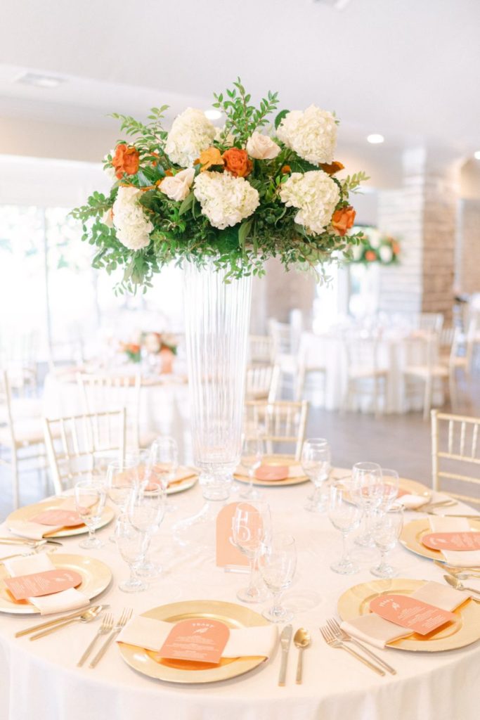 The terracotta details within Arianna and Stephen’s big day create the chic bohemian aesthetic that we love so much! From florals to table numbers to the invitation suite from Eros Studios, every wedding detail contained the beautiful and trendy terracotta color! As we all know, some of the most beautiful weather in Oklahoma happens in September. Arianna and Stephen took advantage of the fall temps and had their ceremony outside. Arianna walked down the aisle under three center arches lining the aisle from Wooden Hearts Boutique filled with greenery and terracotta blooms from Poppy Lane Design. Amanda Watson Photography’s images of the couple under the floral arches are some of our absolute favs from the day!