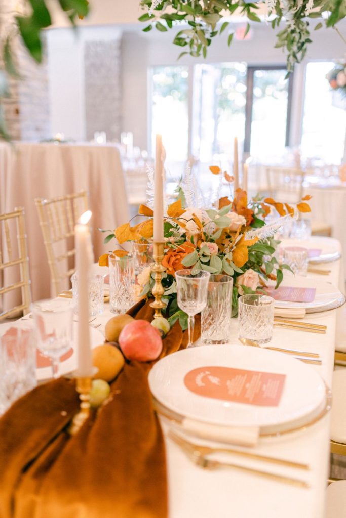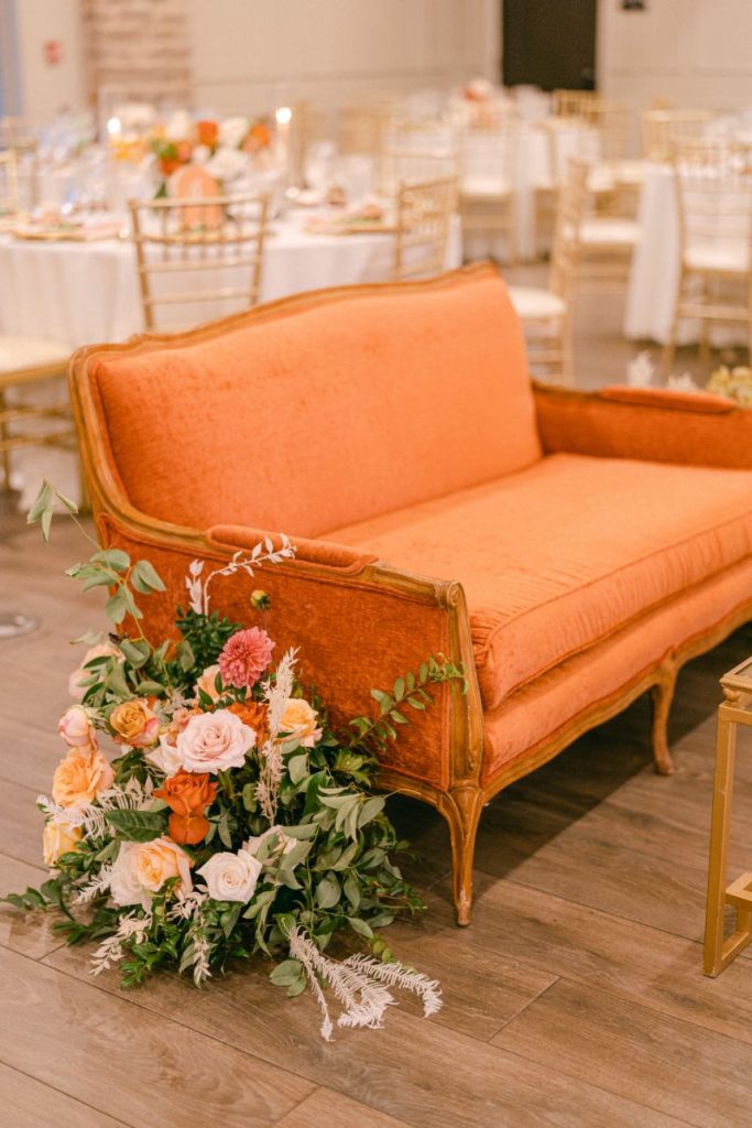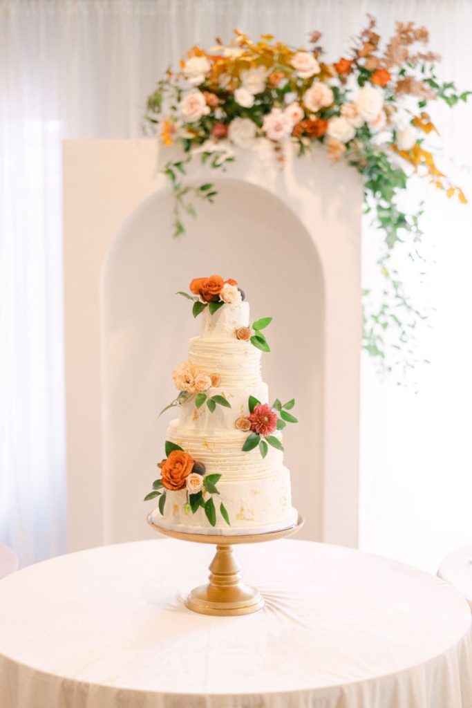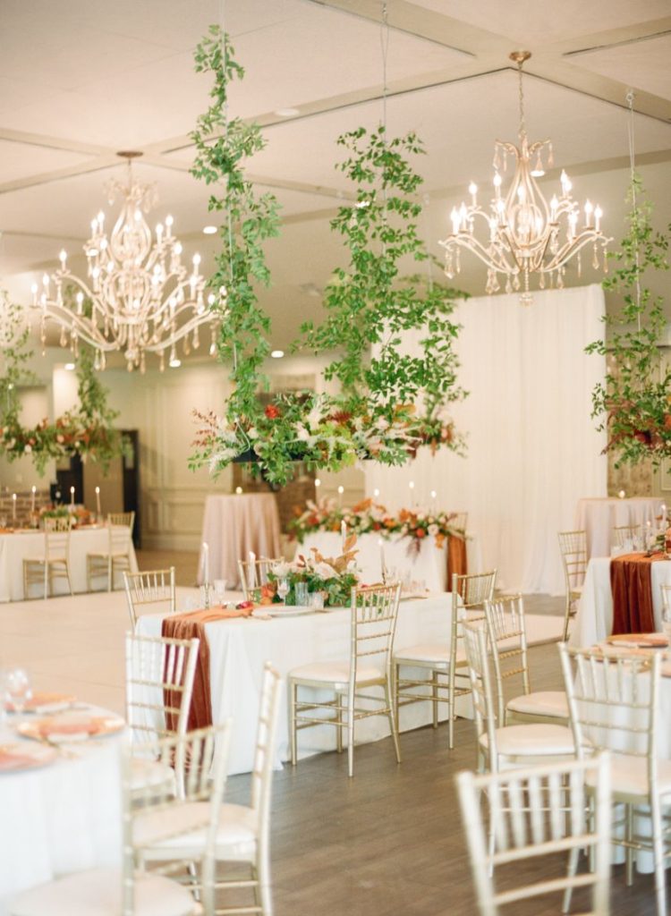 After becoming Mr. and Mrs. Stephen Menzel, the couple and guests made their way to the reception hall. Inside, rentals and decor from Marianne’s Rentals transformed the space into a bohemian dream! Poppy Lane Design added to the magic head table by hanging greenery and florals from the ceiling– absolutely stunning. Arianna and Stephen celebrated their night with dinner, dancing, and a delicious slice of cake from Amy Cakes. If you want to see more bohemian chic details, keep scrolling!