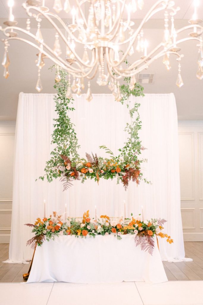 “We loved having the ceremony outside in the gardens at Coles Garden Wedding and Event Center with the arches from Wooden Hearts Boutique and placing the overhead floral above the tables at the reception! It was truly magical.”