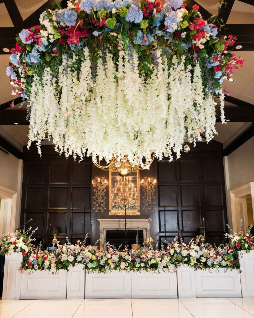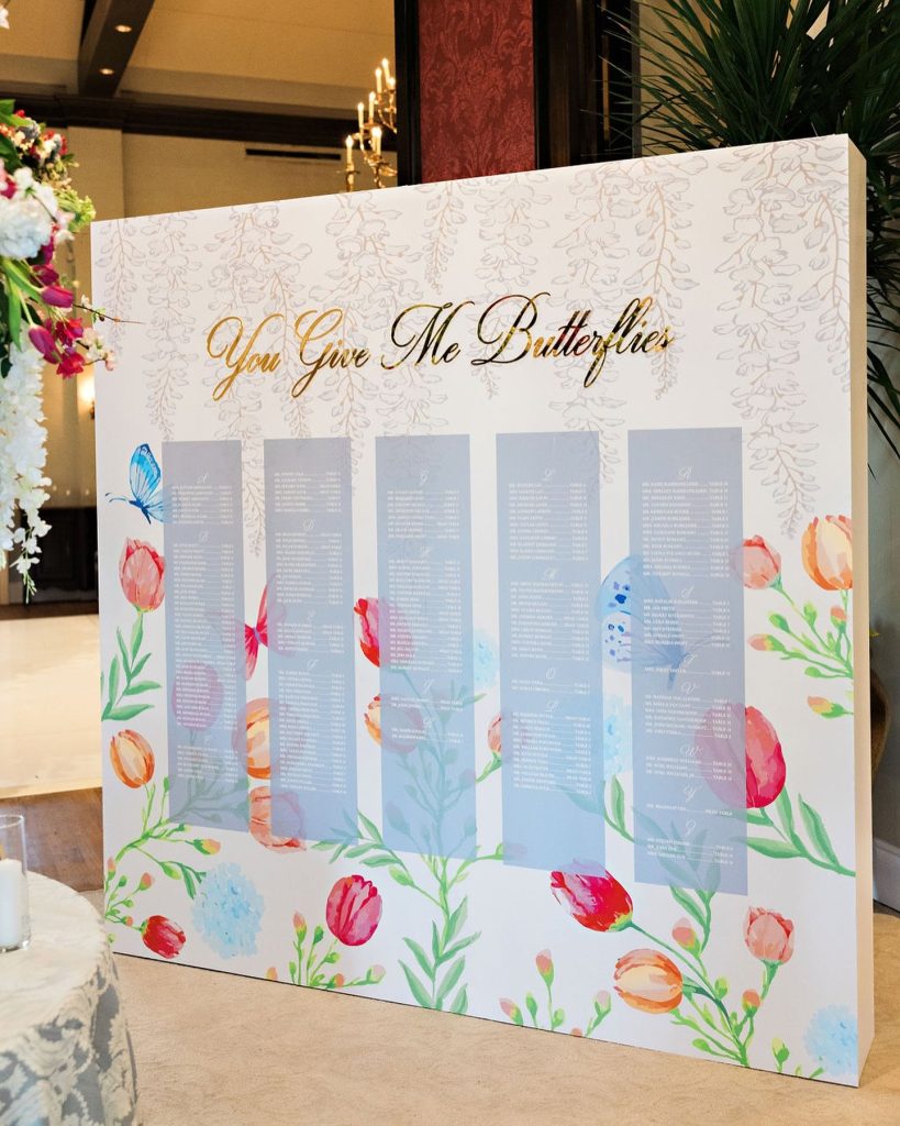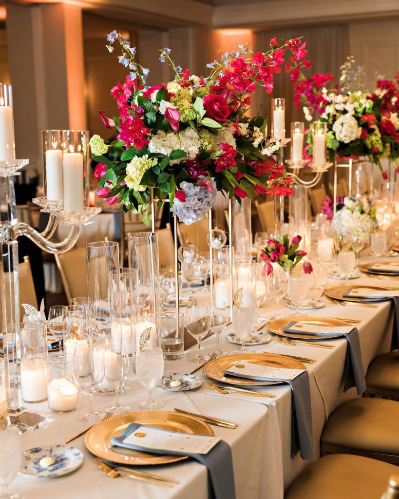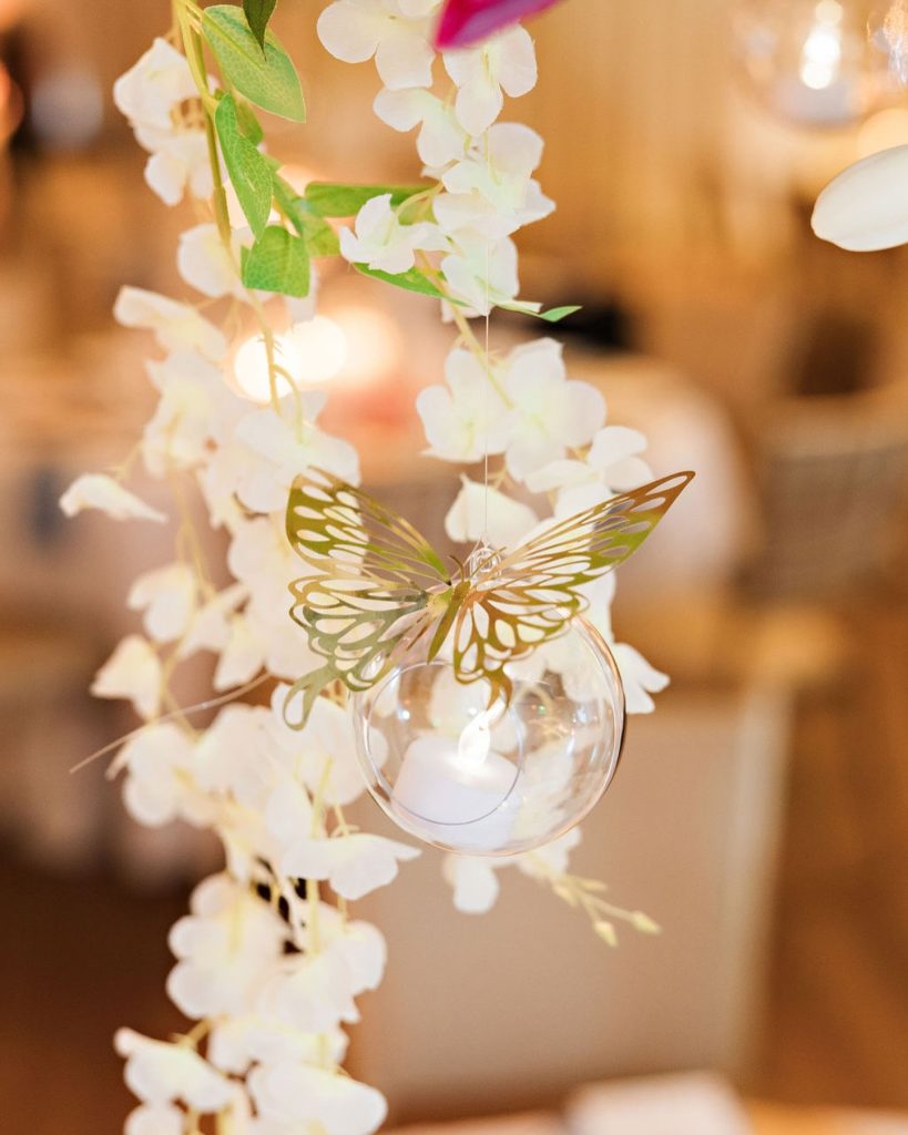 Aubrey and Michael’s wedding theme embraced vibrant spring colors, elegant flares, and butterflies. The bride shared, “I wanted the vibe to represent a spring garden at nighttime. XO by Haleigh Kenney brought the house down with the most amazing large floral displays and installations. Our favorite part was the globes hanging from the centerpieces and floral chandelier. These globes contained a fake votive inside, and then Haleigh attached a gold metallic butterfly onto each of the hanging globes, so it looked like butterflies were floating around the rooms! The hanging butterflies and heavy candle presence made it magical and truly captured the essence of a spring garden at night.”