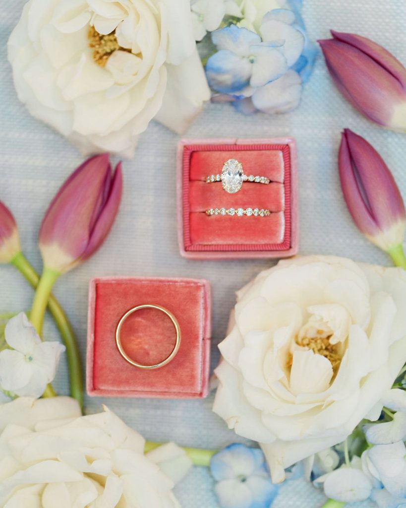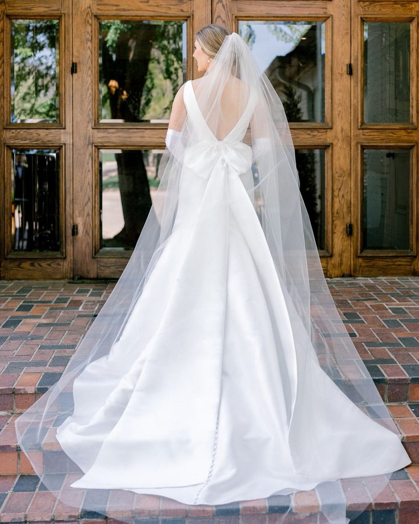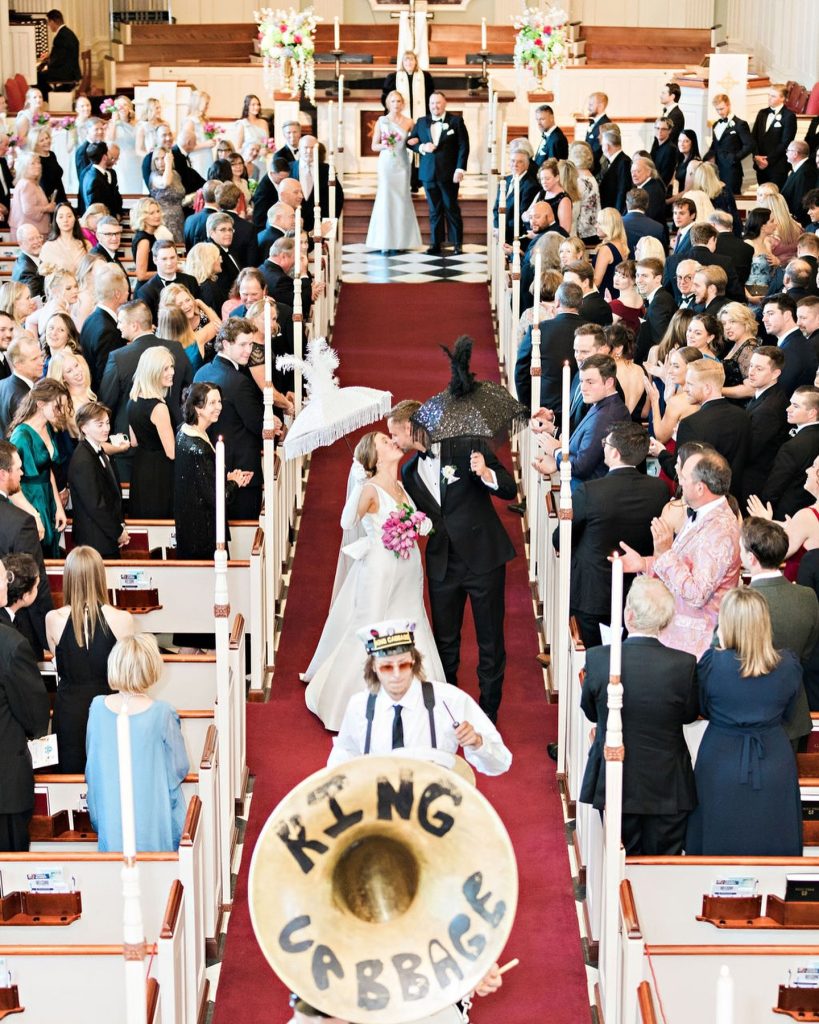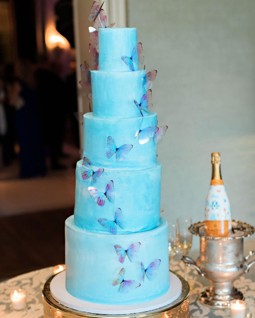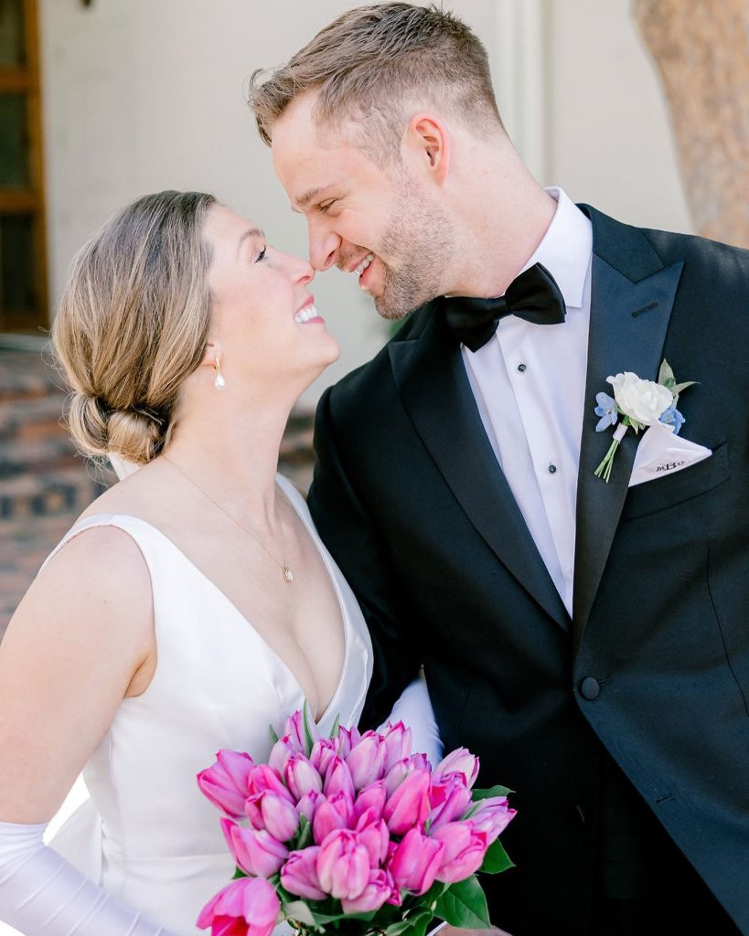 Aubrey and Michael’s wedding theme embraced vibrant spring colors, elegant flares, and butterflies. The bride shared, “I wanted the vibe to represent a spring garden at nighttime. XO by Haleigh Kenney brought the house down with the most amazing large floral displays and installations. Our favorite part was the globes hanging from the centerpieces and floral chandelier. These globes contained a fake votive inside, and then Haleigh attached a gold metallic butterfly onto each of the hanging globes, so it looked like butterflies were floating around the rooms! The hanging butterflies and heavy candle presence made it magical and truly captured the essence of a spring garden at night.”