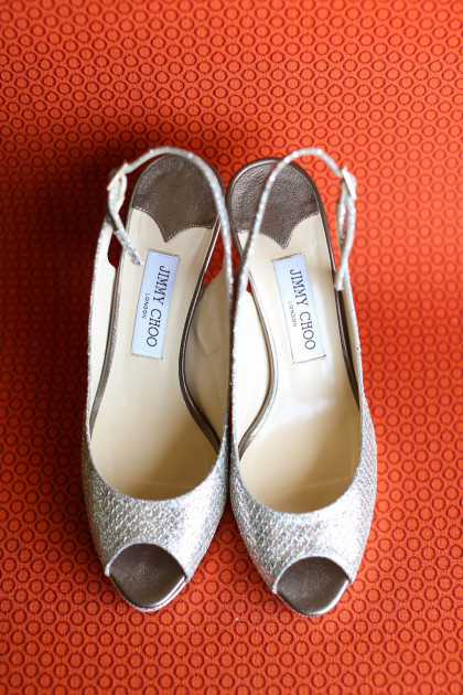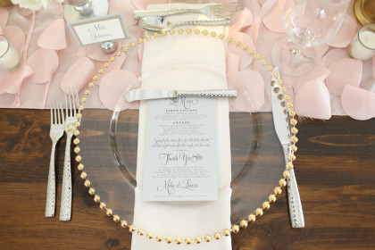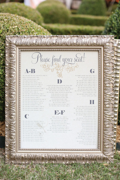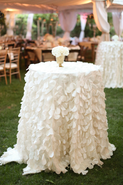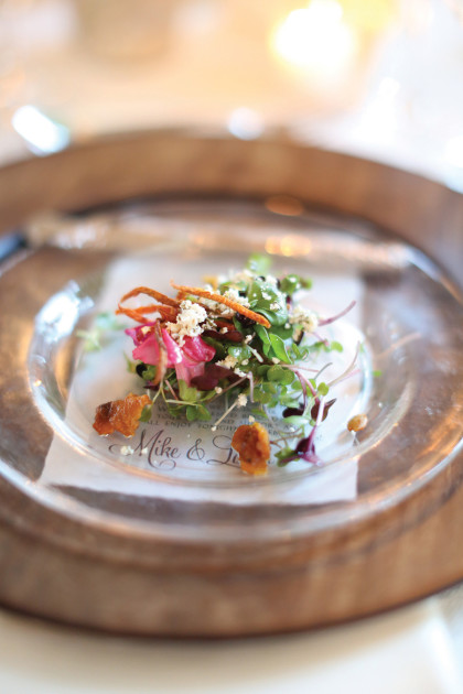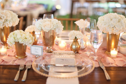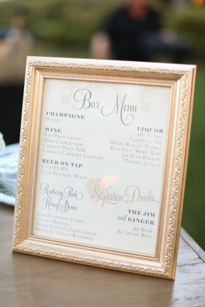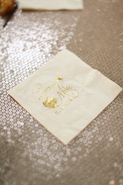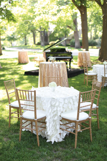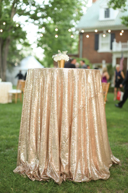 After the ceremony, the couple and guests retreated to the bride’s parents’ home. An unforgettable moment for Laura was arriving with her new husband at her parents’ front yard. Three hundred guests filled the lawn draped with twinkling café lights and covered with glittering gold sequined bistro tables. They enjoyed their cocktails as Amy Cottingham played the grand piano. It was a breathtaking scene that looked like something out of the Great Gatsby. Laura and Mike took this chance to watch the celebration from afar in a trolley while soaking it all in.