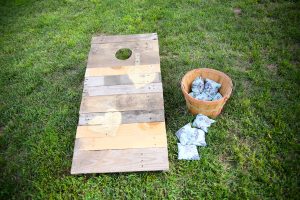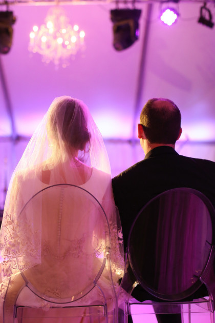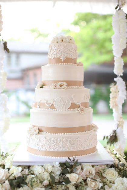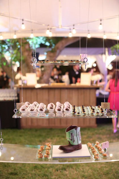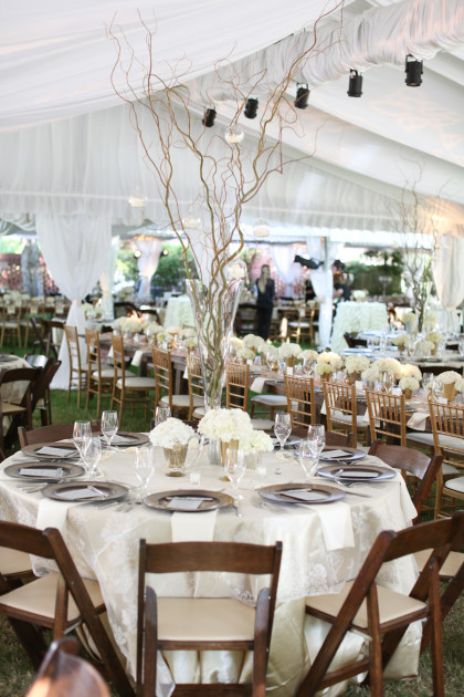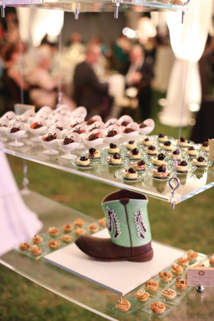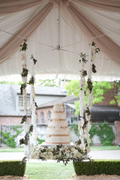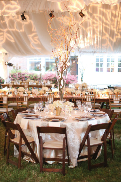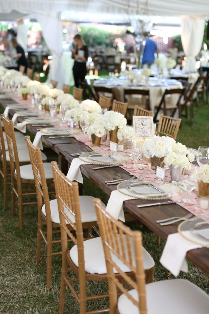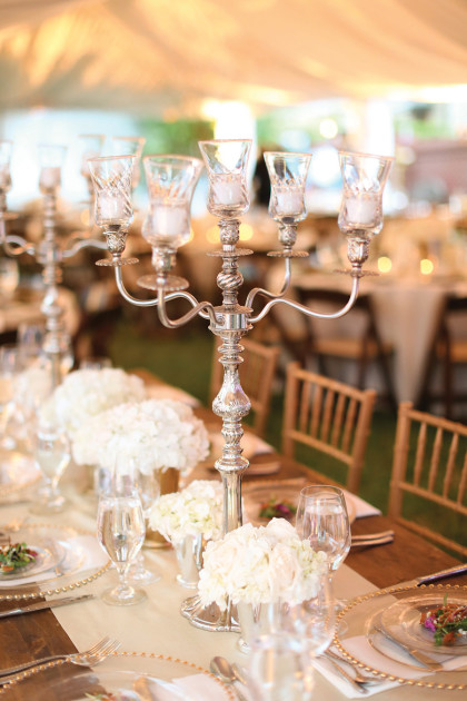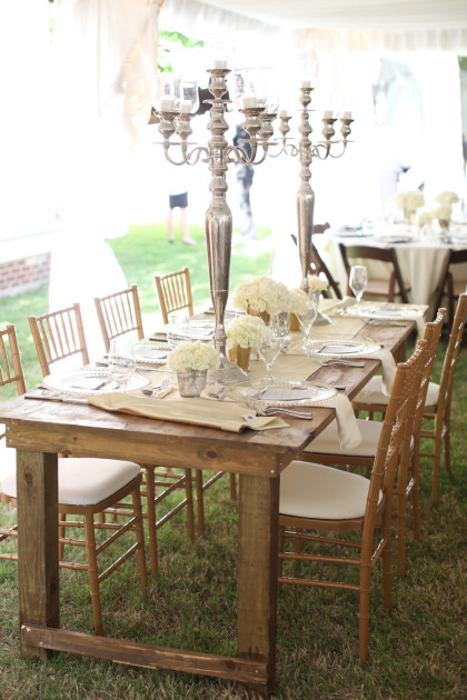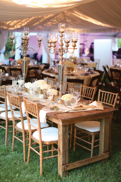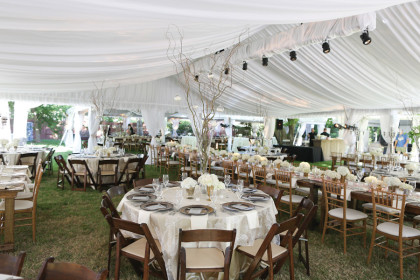 After cocktail hour, the guests then moved to the back yard where the reception tent housed the celebration for the rest of the night. The entrance tent featured the wedding cake suspended from the ceiling by flower-coated cables. Wooden farm tables lit by candelabras intermingled with linen-draped tables covered in flowers to set a rustic yet elegant tone. After a prayer from Reverend John Powers, a three-course dinner was served with toasts from the father of the bride, the best man and maid of honor. After dinner, guests danced the night away to the band, HOOK, and enjoyed delectable miniature desserts suspended from the ceiling on Lucite trays. A late night snack of fish and chips was served to cap the evening.