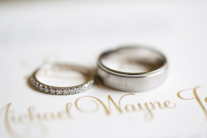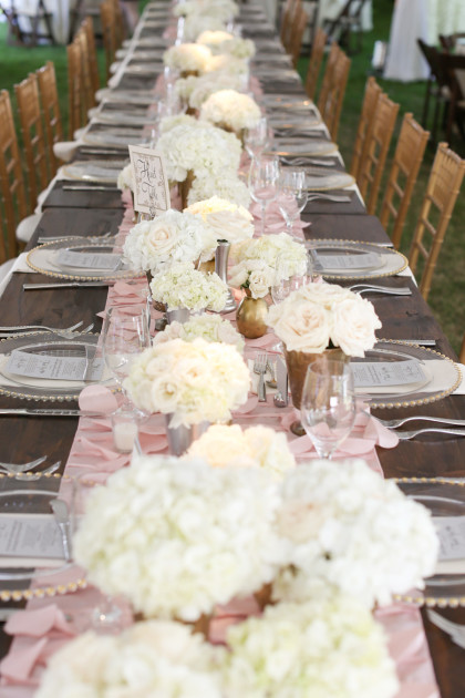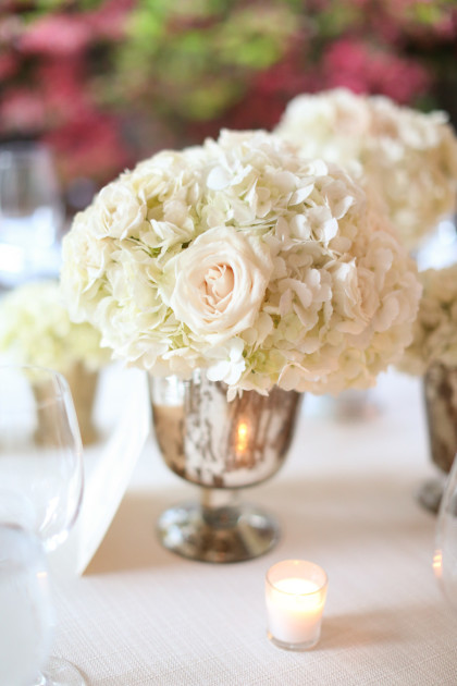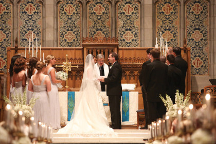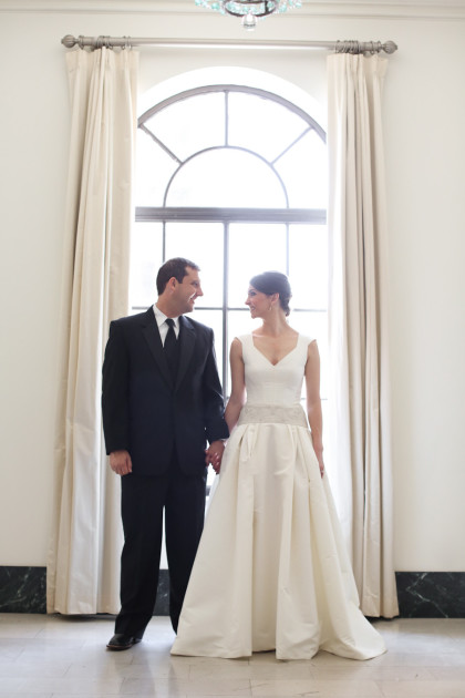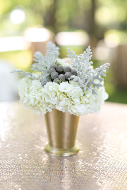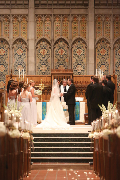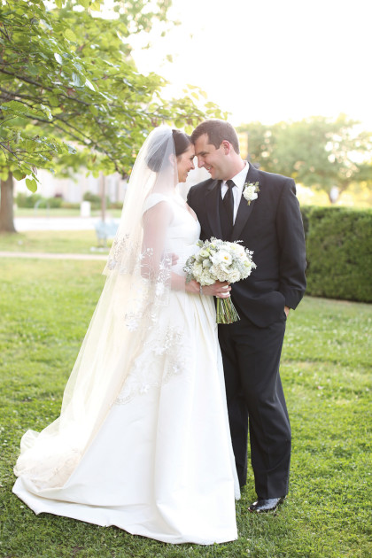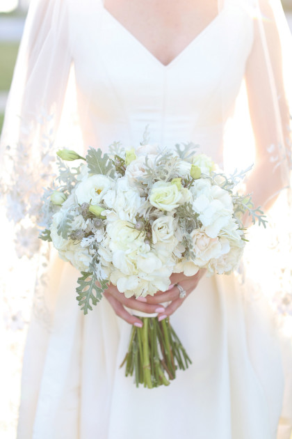 To match such an awe-inspiring processional song, the bride donned a gorgeous ivory silk faille ball gown with cap sleeves, embellished waist and cathedral train by Carolina Herrera. She paired it with a hand-painted, cathedral-length veil, also by Carolina Herrera. Teardrop earrings lined with diamonds borrowed from bridesmaid Stephanie Lewis and an antique diamond bracelet borrowed from grandmother Pat Hawkins completed her look and worked as Laura’s “something borrowed.” The bride clutched a fresh bouquet of white hydrangeas, dusty miller, berzillia berries, ivory spray roses and white lisianthus.