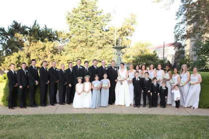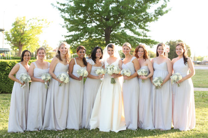 With 23 people in the wedding party, you could see the love and support for the couple in the room. Jenny York was the maid of honor. Tyler Mullman and Caleb Ellington served as the best men. The bridesmaids wore Amsale full-length crinkle chiffon gowns with varied necklines in Dove grey and carried bouquets of white hydrangeas and dusty miller.