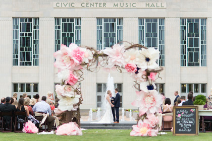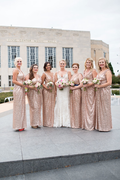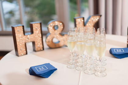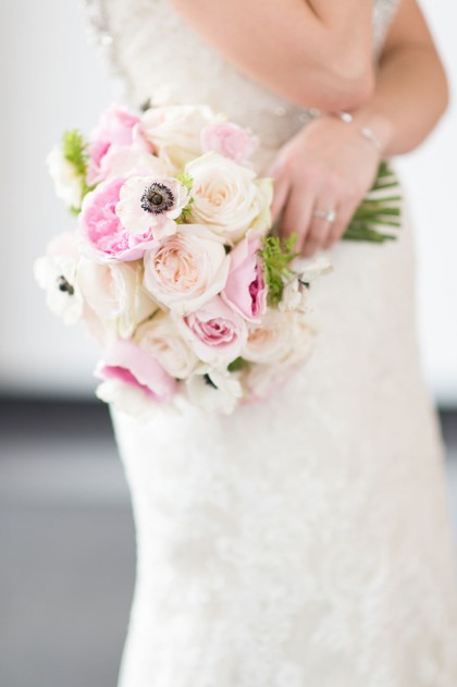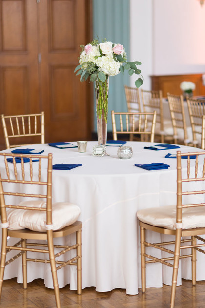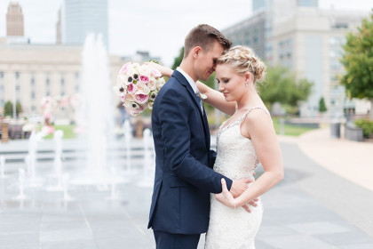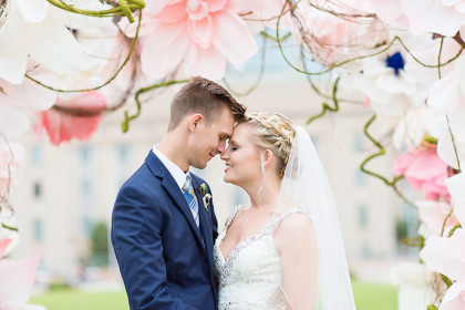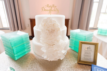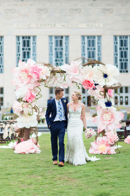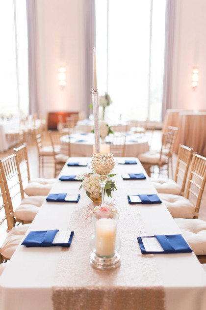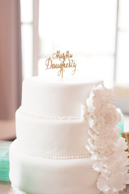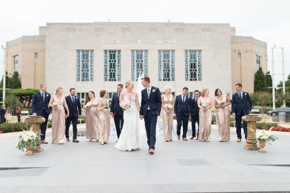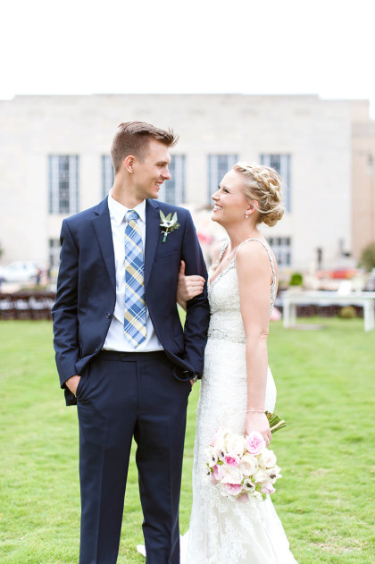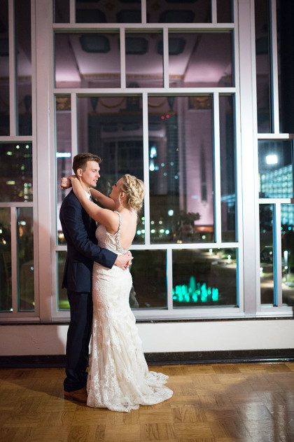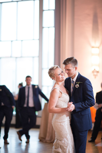 Kristin and Hayden’s wedding contained a mix of neutral blush, ivory, light pinks and champagne with navy and gold accents. Kristin wanted something simple and classic with a pop of modern radiance. The bride wore a fit and flare ivory lace gown designed by Impression Bridal, which featured a deep sweetheart bust line, a beaded belt at the waist and a chapel-length train with delicate beading on the edge, which bustled into a waterfall bustle for the reception. One of the couple’s favorite memories from the wedding was dancing to “Sweet Thing,” the couple’s first dance song, after guests had left the reception. Kristin and Hayden wanted to soak in a moment of solitude and value their new marriage before the night was over.
