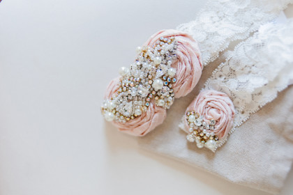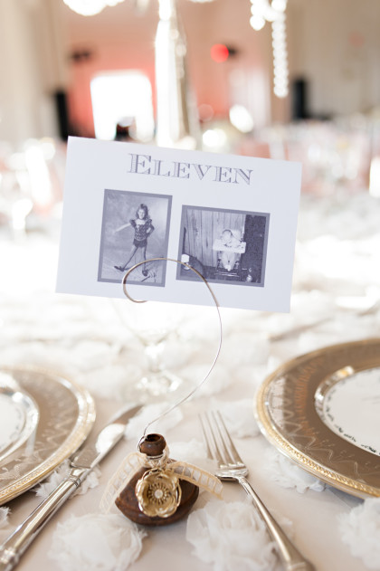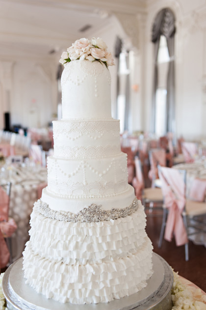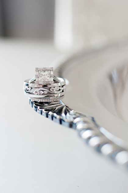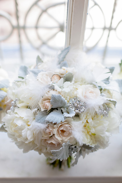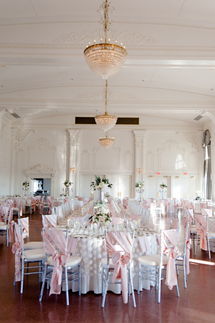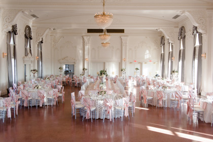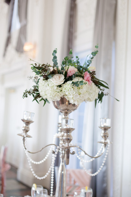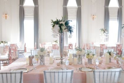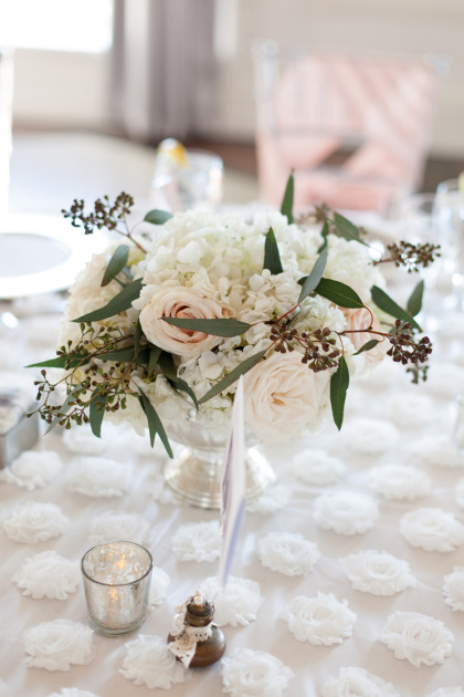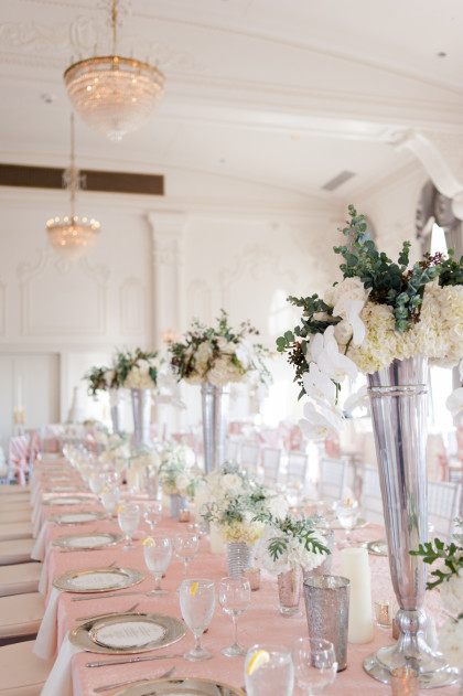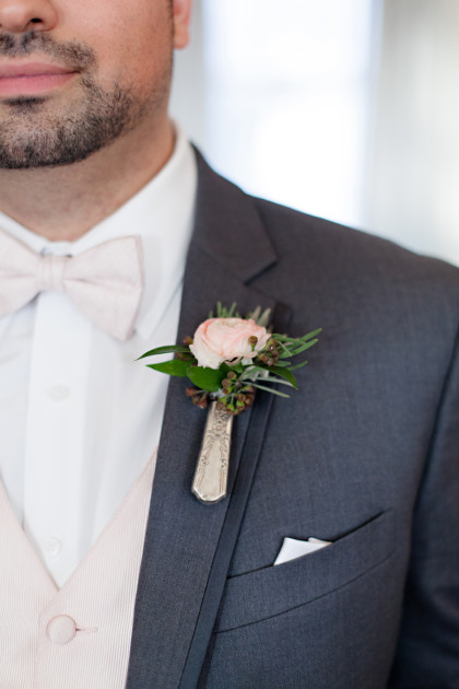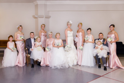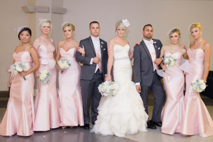 Savannah and Eric were surrounded with their closest friends and family members with a wedding party of twenty-seven. Savannah’s sister, Kayla S. Gaddis, was the matron of honor and wore a floor-length, strapless, light pink Lazaro gown that matched the bridesmaids, Nicole Ticknor, Jennifer Nguyen, Bonnie Lloyd and Jessica Kisinger. All of the ladies carried bouquets that coordinated with the bride’s bouquet that featured white hydrangeas, ivory roses, ivory spray roses, champagne roses, white peonies, lamb’s ear and vintage brooches. The bride tied her grandfather’s wedding band to her bouquet like her mother and sister did before her, which made the evening even more special. The bride’s men were Adam Lovell and Shervin Shayegan, and they looked dapper in grey suits with light pink vests and bow ties.