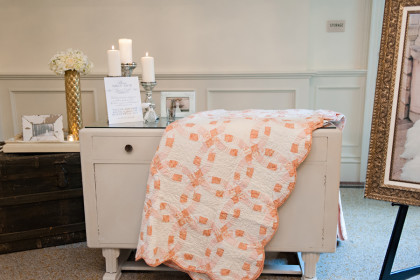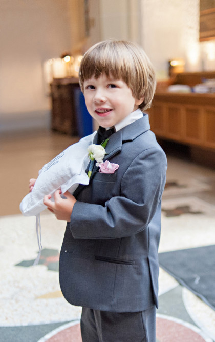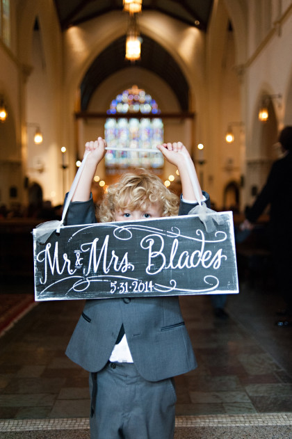 The groomsmen stood dutifully by Eric in charcoal three-piece suits and matching ties with light pink pocket squares and boutonnieres. Douglas Rinehart was Eric’s best man while Josiah Moore, Eric Barnes, Patrick Bennett, Matthew Sheets, Chris Dennis and James Brooks served as groomsmen. Hudson Gaddis and Ryland Knight played the part of ring bearers, supporting a sign that read “Mr. & Mrs. Blades” as they walked down the aisle.