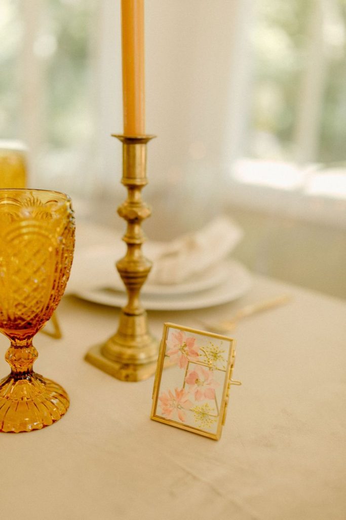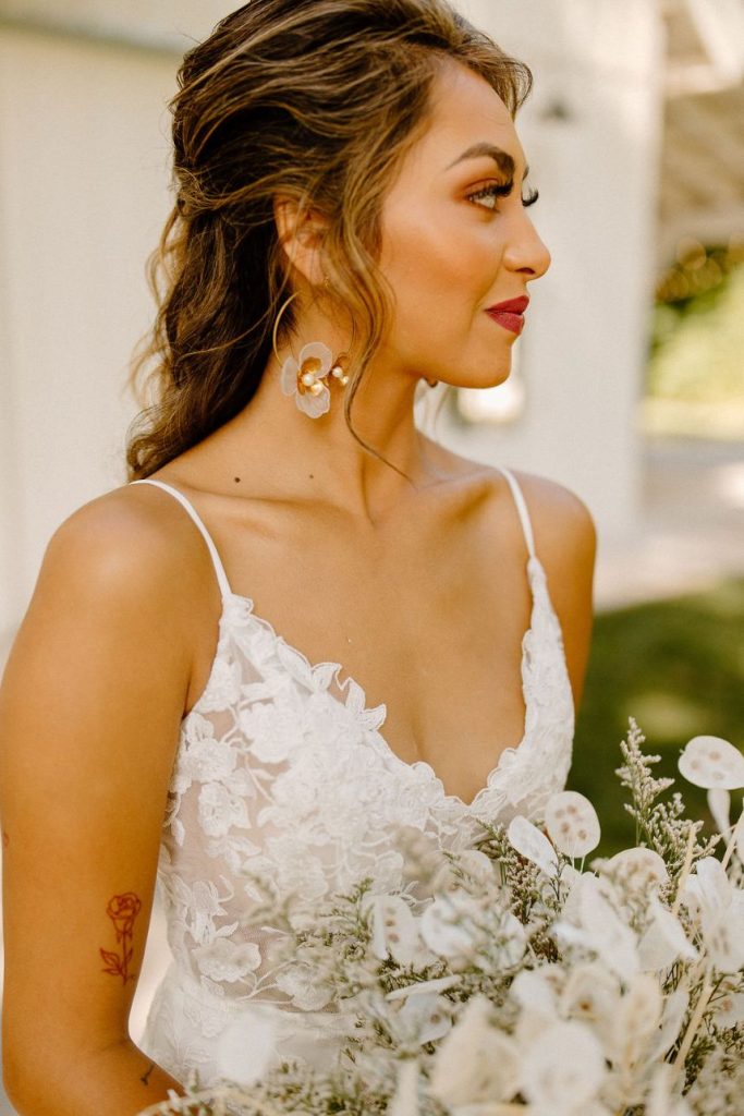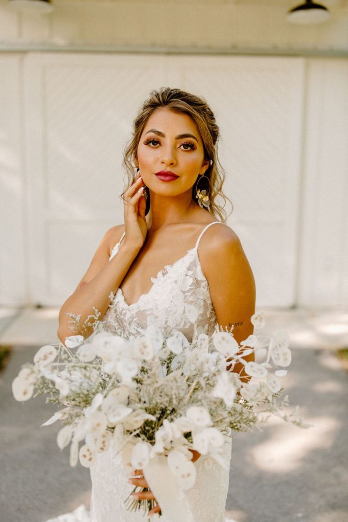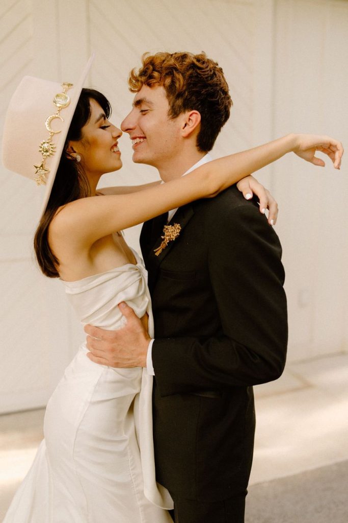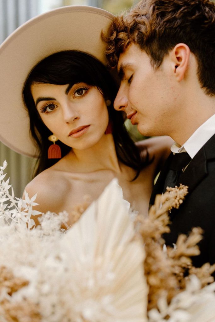 Every wedding inspiration shoot tells a story, but this one actually tells two! Consisting of all the must-haves and staples of boho southwestern wedding inspiration, this shoot held at Spain Ranch is like a holy grail mood board for those who crave desert tones or anyone on the art deco arch trend! Our solo bride models a more traditional, wild-spirited bohemian look, while our faux bride and groom embody a contemporary, art-deco take on the style. We are absolutely obsessed with both! Party Pro Rents has all the linens and decor you need to create a breathtaking, vintage-inspired tablescape complete with elegant candles in shades of terra cotta, gilded candlestick holders, ornate amber glass chalices and resin-pressed botanical cameos. Is retro furniture more fitting for your wedding theme? Scavenged Vintage Rentals specializes in larger furniture pieces that are just perfect for any vintage, bohemian affair – just mention the word “wicker.” Dried florals abound make every wedding scene feel just a little bit closer to Sedona, and we say you can never have too much pampas grass! With all its romantic, desert-toned details, we are definitely bookmarking this boho southwestern wedding inspiration for later. Read on for a note from the planner about the venue as well as the vision behind this stunning styled shoot. Cheers!