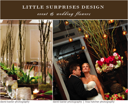 Branches are a big deal! Incorporating big branches or even actual trees has been a huge hit at Oklahoma wedding receptions. From the sophisticated affair to the true green Oklahoma wedding, a bit of bark can really add texture and appeal. We snagged a few of our favorite snap shots from The [B] Galleries of designs of Oklahoma wedding florists. Centerpieces like the ones above with giant curly willow branches surrounded by the softest of petals or even a more simplistic look of just birch branches by themselves have really been a rage, so we just wanted to share!