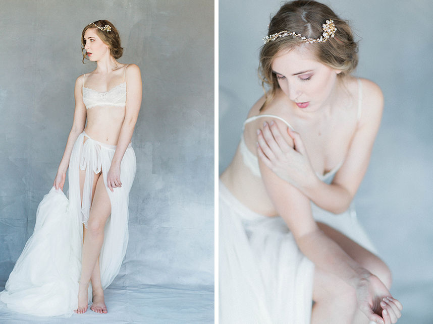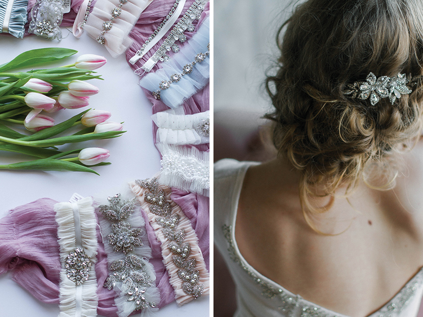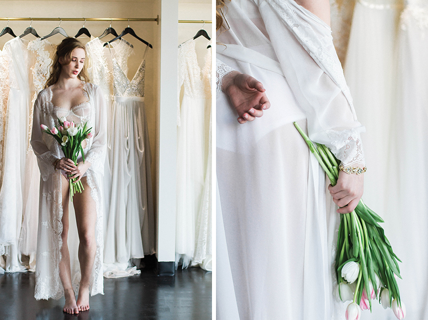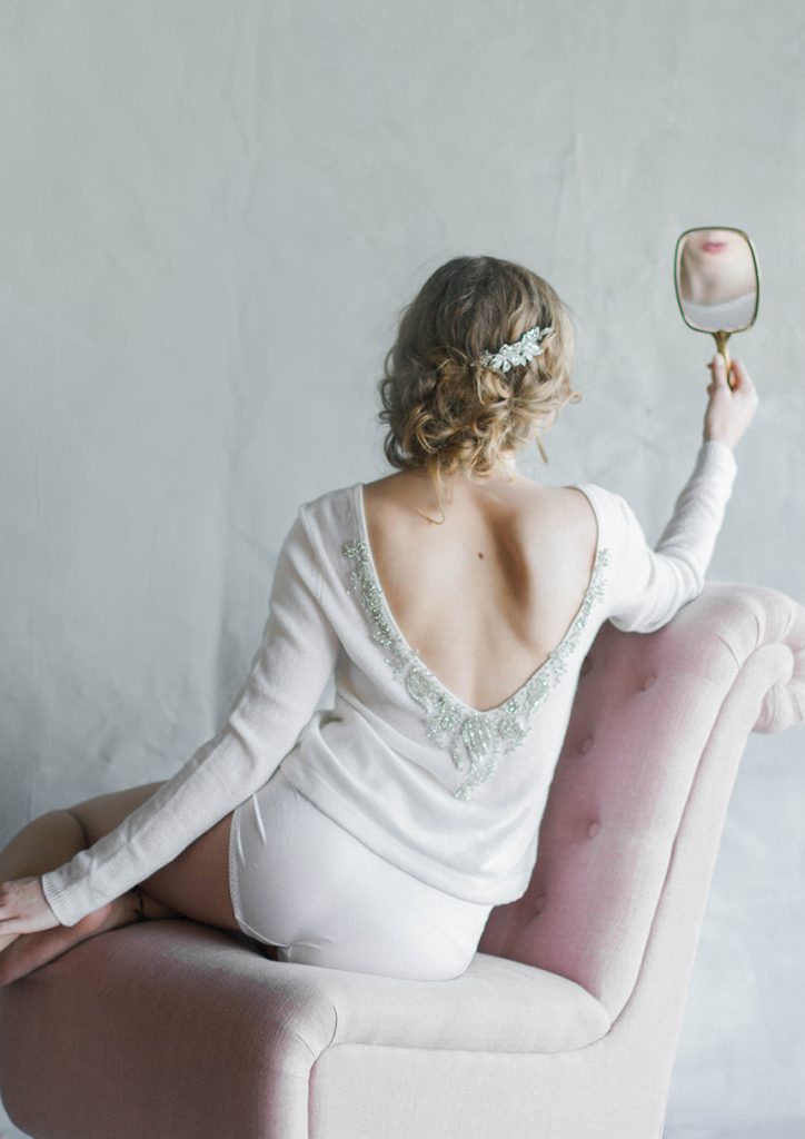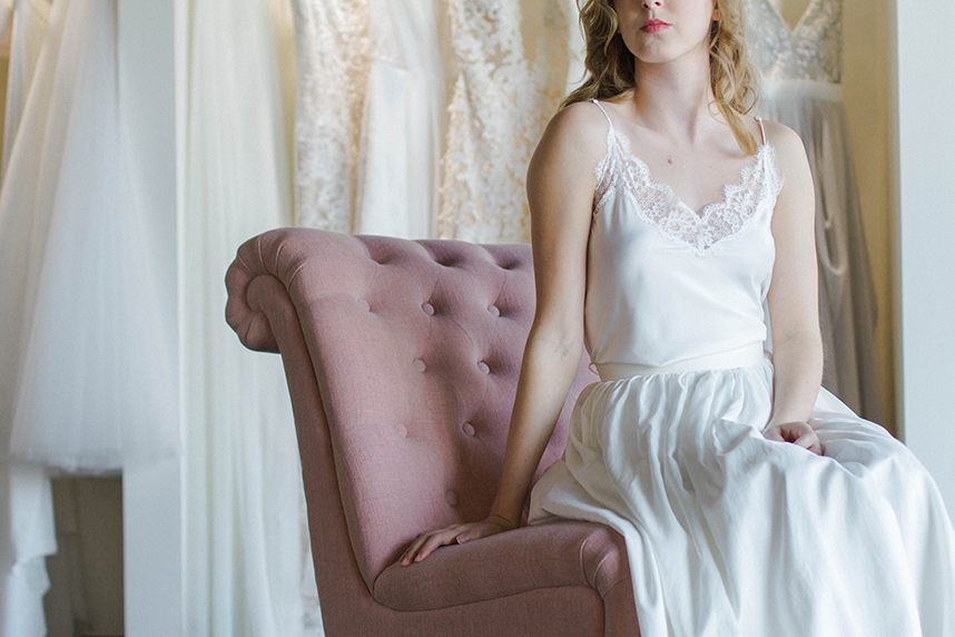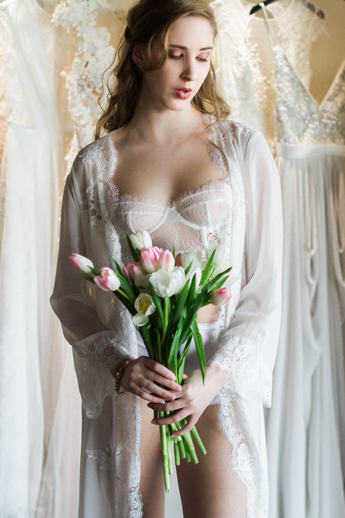 Take a peek at this lovely and intimate bridal boudoir shoot Modern Love Photography captured amongst the luxe wedding dresses at local bridal boutique Chantilly Couture. Using the sparkling jewelry, garters and hair pieces as accessories and rows of flowing bridal gowns as a backdrop, this exudes every bit of femininity that you’d expect from a boudoir shoot. We love how the model bride is fitted in bridal separates along with classic lingerie pieces for a new take on this style of shoot. Happy Friday!
