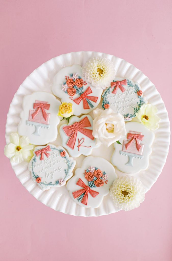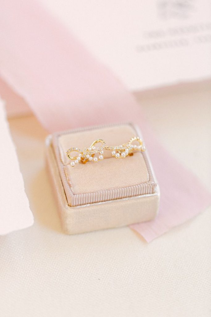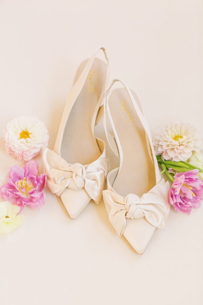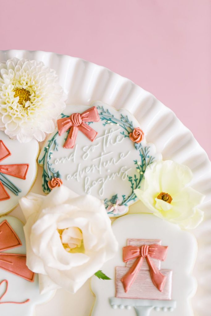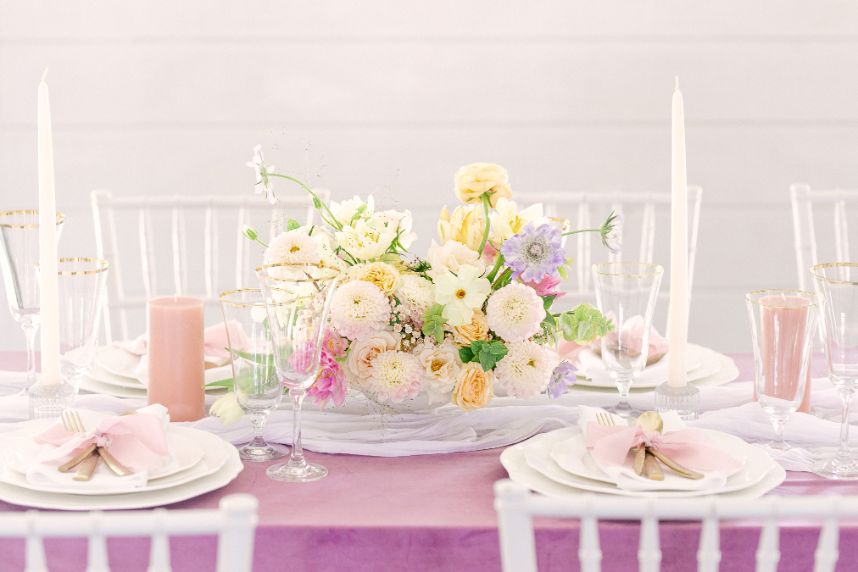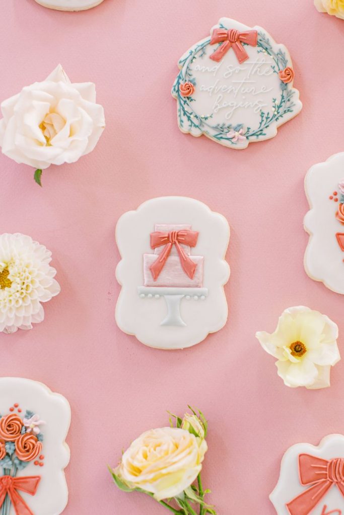Elegant and springy while incorporating just the right amount of preppiness, this colorful wedding editorial captured by Emily Nicole Photo is all about showing off bridal bows being back in a big way. Everywhere we looked, Dream Point Ranch was transformed into a whimsical wedding scene characterized by pops of pastel florals and lush, butterfly ranunculus blooms by Ever Something. The light and airy flowers made their way into detailed shots of cookies from Flour Cookie Co featuring breathtaking bridal bow elements, detail photos of romantically scripted invitations by No Regrets, as well as centerpieces lining a tablescape awash in lilac linens and other décor from Party Pro Rents. Our radiant bride modeled a simply exquisite strapless gown from The Bridal Boutique just perfect for this wedding editorial occasion, with a low back secured by a big satin bow and a modern take on old Hollywood style glam by beauty professionals Hayley Hall Hair and Makeup by Raven. Read on for notes from some of the talented local creatives that helped to bring this romantic, colorful masterpiece to life and see it down below. Cheers!