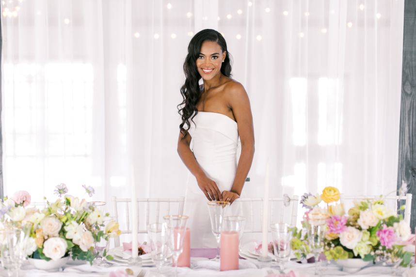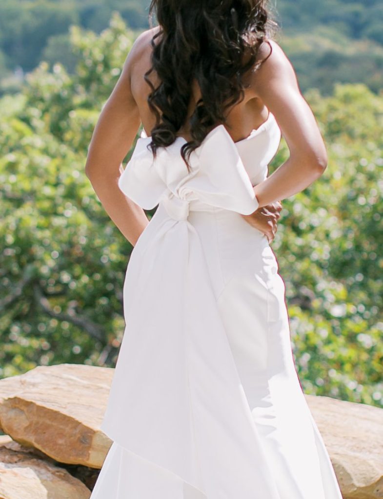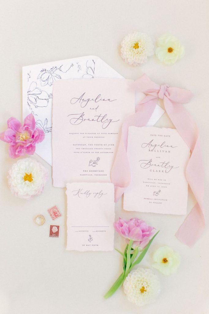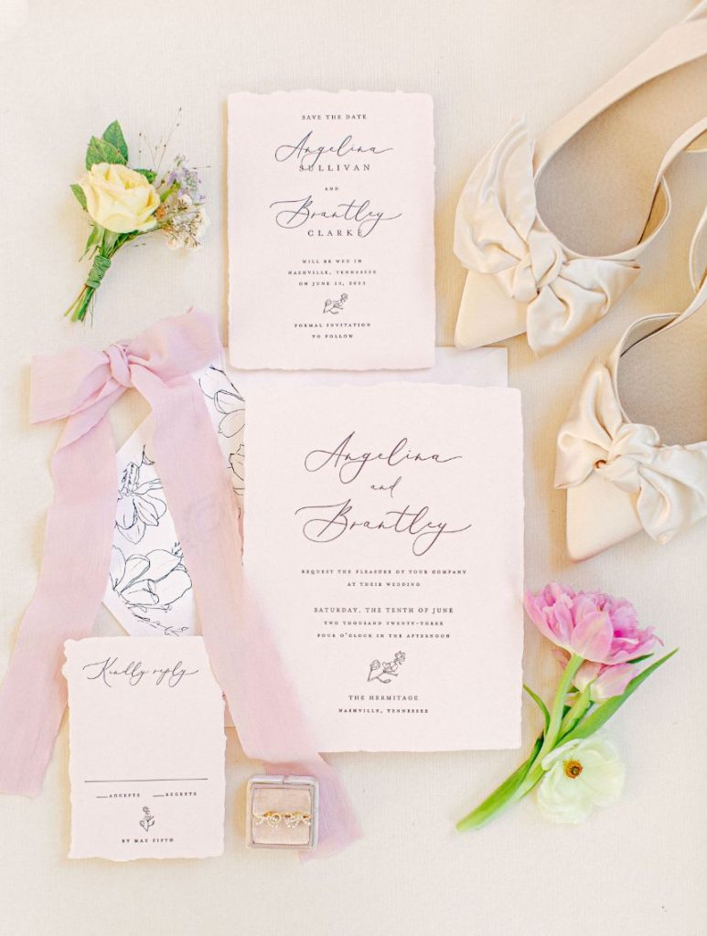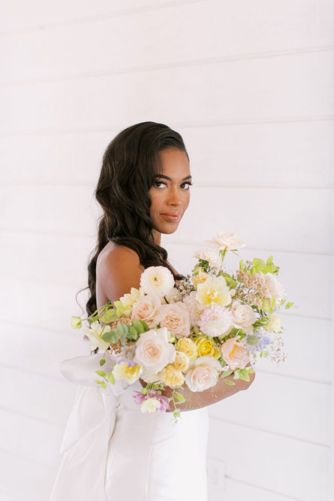 Elegant and springy while incorporating just the right amount of preppiness, this colorful wedding editorial captured by Emily Nicole Photo is all about showing off bridal bows being back in a big way. Everywhere we looked, Dream Point Ranch was transformed into a whimsical wedding scene characterized by pops of pastel florals and lush, butterfly ranunculus blooms by Ever Something. The light and airy flowers made their way into detailed shots of cookies from Flour Cookie Co featuring breathtaking bridal bow elements, detail photos of romantically scripted invitations by No Regrets, as well as centerpieces lining a tablescape awash in lilac linens and other décor from Party Pro Rents. Our radiant bride modeled a simply exquisite strapless gown from The Bridal Boutique just perfect for this wedding editorial occasion, with a low back secured by a big satin bow and a modern take on old Hollywood style glam by beauty professionals Hayley Hall Hair and Makeup by Raven. Read on for notes from some of the talented local creatives that helped to bring this romantic, colorful masterpiece to life and see it down below. Cheers!