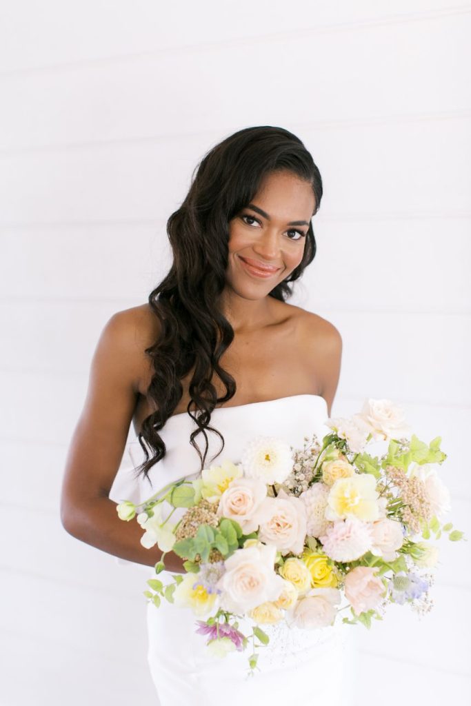 From the florist, Taylor of Ever Something: “The florals we used were blush dahlias, yellow butterfly ranunculus, yellow tulips, lavender scabiosa and lavender tulips. My favorite were the yellow butterfly ranunculus because they’re so light and airy. The palette was really fun to work with because we don’t get to work with yellow often and lavender is always a favorite of ours! It was super fresh and feminine. For the centerpieces, we wanted to create light and airy arrangements that were also packed full of blooms to create a lush centerpiece on the table. We mimicked a similar style for the bouquet keeping it a bit smaller scale with blooms floating out of the bouquet. We just wanted to match the overall vision of feminine and sweet details!”