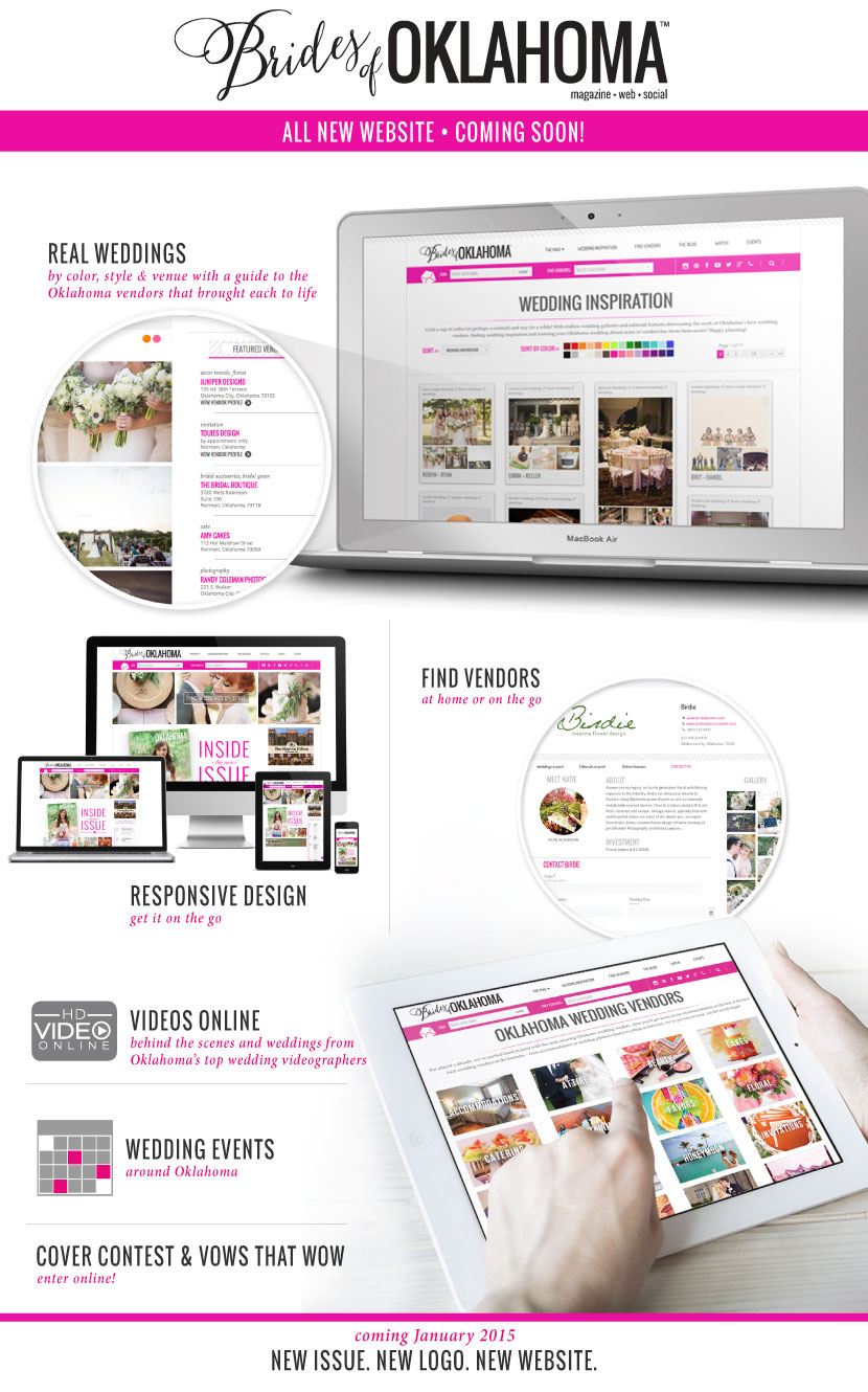 Last week, we were thrilled to share the beautiful cover bride for the next amazing issue of Brides of Oklahoma that’ll be released in January (pre-order your copy today and get your hands on the issue first)! And, we continued our celebration last week, as we unveiled our new logo design, but we may be even more excited to share a little preview of what’s coming after the New Year! Brides of Oklahoma’s website is getting a major face lift and we can’t wait to show you all the bells and whistles. As we put the finishing touches on it, we thought we’d give our audience a little glimpse of what’s to come in just a few short weeks! You’ll find hundreds upon hundreds of inspiring images from a huge collection of seriously beautiful Oklahoma weddings, access to the absolute best wedding vendors from across the state and a guide to wedding events, sales and promotions you won’t want to miss! The website is fully responsive making it easy to navigate whether you’re on a mobile or tablet device or laptop or desktop computer. We’re counting down the days to the launch of this fresh new site just after the New Year and just in time to jump start wedding planning for so many Oklahoma brides as we welcome 2015! Stay tuned and cheers to a “Marry” Christmas and a dazzling New Year!