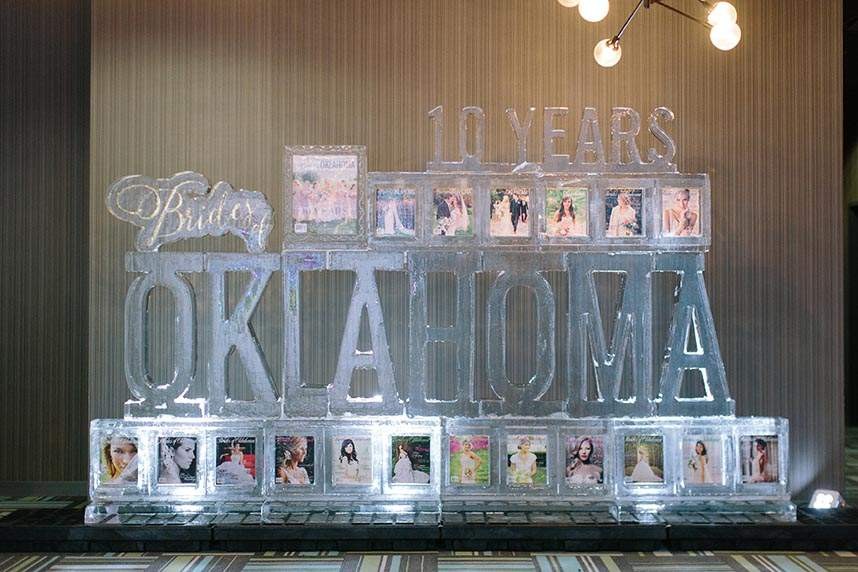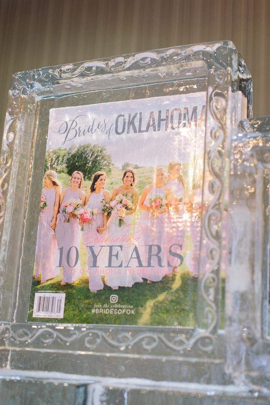 Speaking of oversized and over the top, we knew we could trust Vault Ice with the wow factor! We wanted to display all 19 covers from the past issues of Brides of Oklahoma, and Vault Ice created a 9 ft tall x 15 ft long ice installation to house them all! As one of the first things our guests saw when they rounded the corner into the main event space, we can’t measure the buzz that was created from this amazing focal piece! It was certainly one of the most photographed elements of the evening, popping up on social media almost instantly. Vault Ice is so in tune to details, they also provided ice blocks with the number “10” etched in to them to accompany our signature cocktail! Huge thanks to Vault Ice for adding these amazing touches to our birthday event!