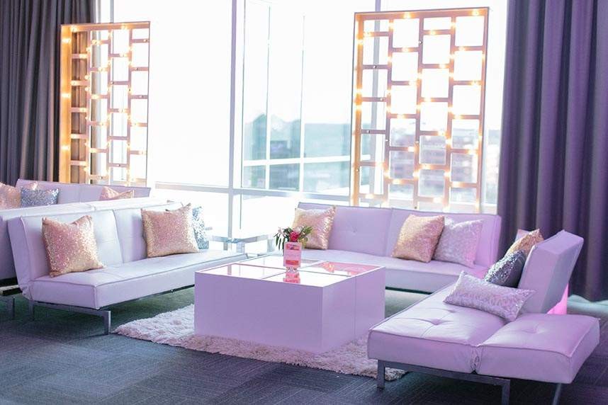 Along with the streamers, we filled the event space with posh lounge furniture, swanky tables and stunning linens. We have our incredible rental companies to thank for this: Marianne’s Rentals for Special Events, Mood Party Rentals and Party Pro Rents.